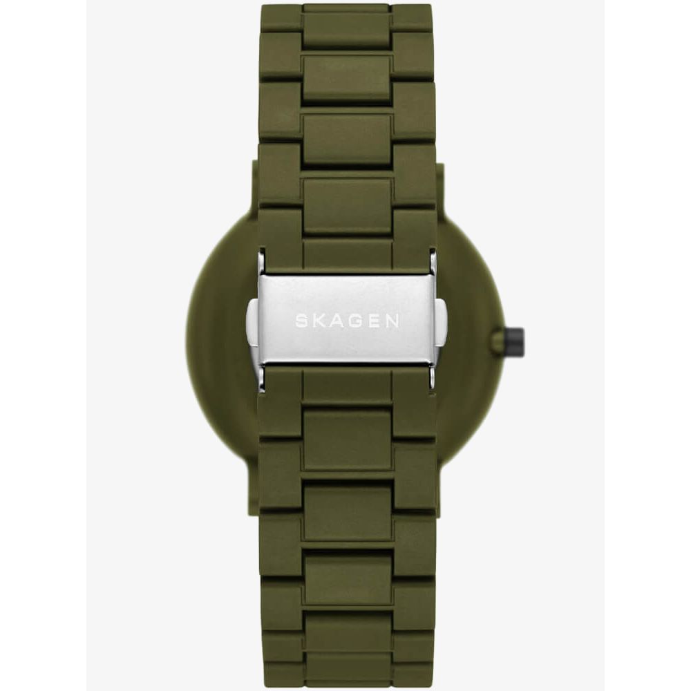 The Skagen Mens Aaren Ocean Seaweed #tide ocean material Watch SKW6771 combines a 41mm round shaped #tide ocean material case and a green #tide ocean material strap with a push button deployment clasp. It has a green #tide ocean material analogue dial with luminescent indexes, which is protected beneath mineral crystal glass. Power is generated by the quartz movement. This model also has a water resistance of up to 30 metres.