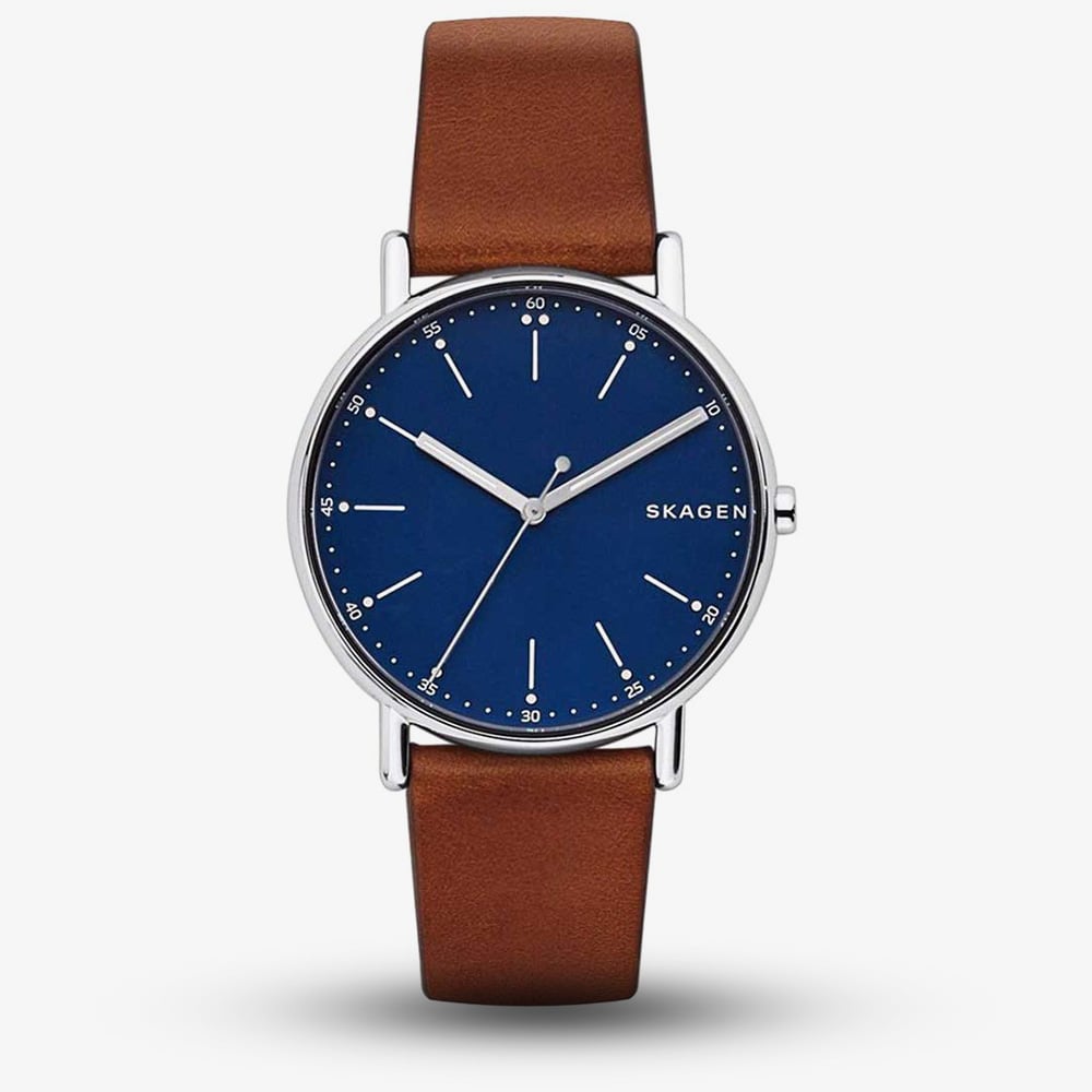Jazz up your everyday outfit with this signature men's watch from Skagen. The handsome blue dial consists of thin hour markers, as well as 60 second display, along with luminescent hands.