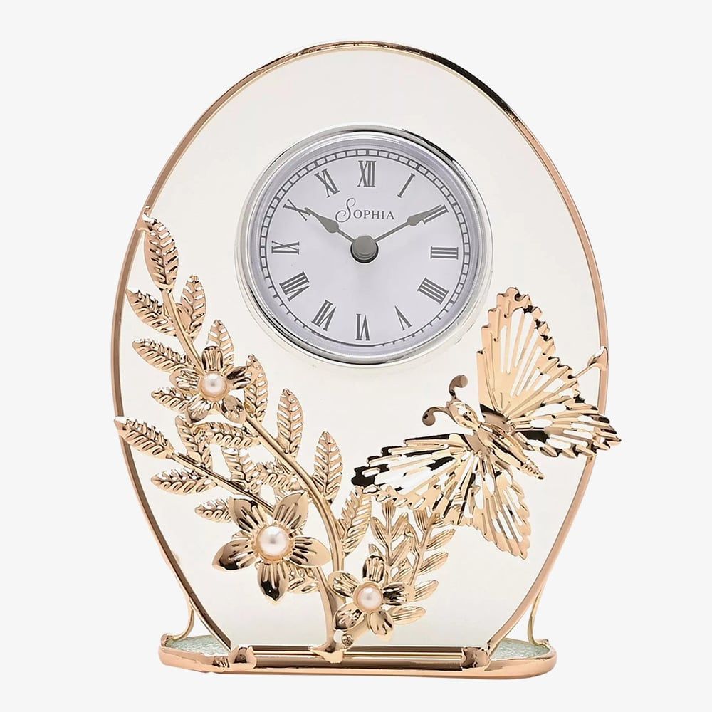 https://www.thbaker.co.uk/sophia-gold-butterfly-mantel-clock-sp3506ck178620Sophia Gold Butterfly Mantel Clock SP3506CKhttps://www.thbaker.co.uk/media/catalog/product/2/7/27-05-25156374_01.jpg29.9529.95GBPInStock/Gifts/Clocks/Gifts/Clocks/Mantel/Gifts/testing-categories/Test_Andrew/THB-1888-Widdop6727672936877983123687672764287149Gold Butterfly Mantel Clk Wht Dl Add elegance to your home décor with the Sophia Gold Butterfly Mantel Clock. Showcasing an intricate design of butterfly and floral motifs crafted from gold tone metal, the oval shaped clock is complete with a round white dial, Roman numerals and black spade hands powered by the Quartz movement for reliable timekeeping. Sophisticated and functional this Sophia clock would be a beautiful gift to mark a special occasion or addition to your own home. Battery operated, not included.