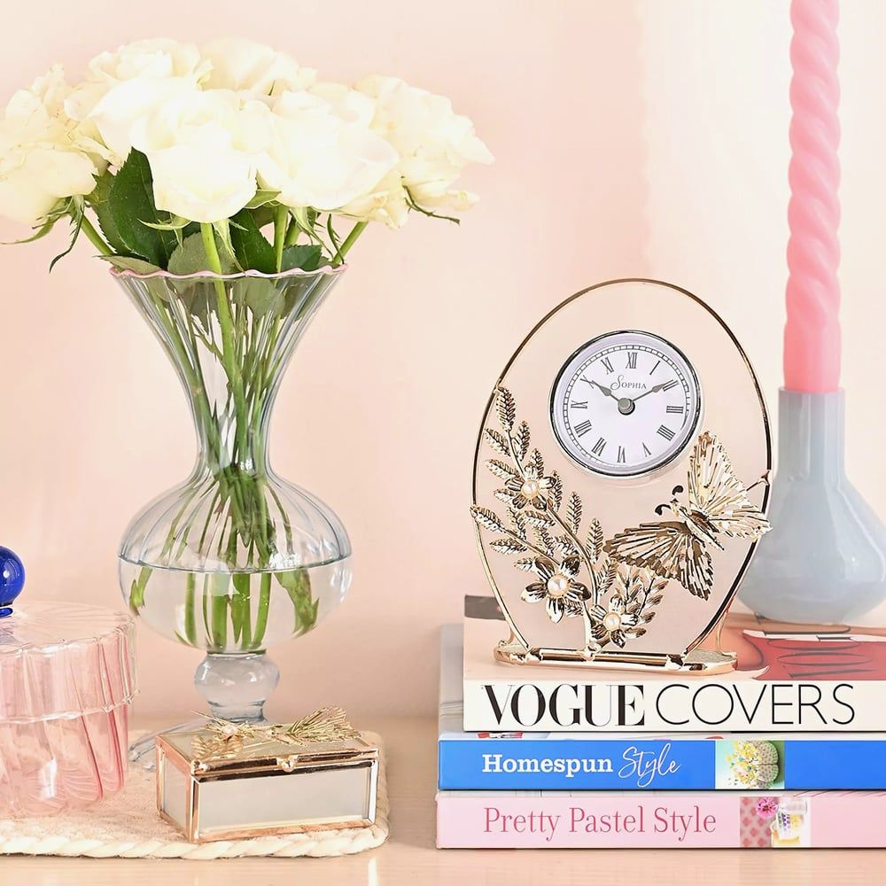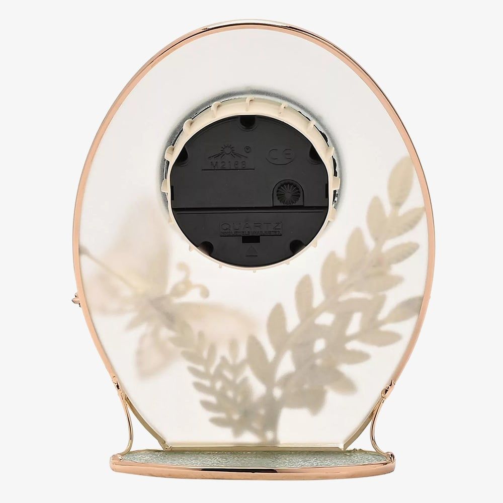 Add elegance to your home décor with the Sophia Gold Butterfly Mantel Clock. Showcasing an intricate design of butterfly and floral motifs crafted from gold tone metal, the oval shaped clock is complete with a round white dial, Roman numerals and black spade hands powered by the Quartz movement for reliable timekeeping. Sophisticated and functional this Sophia clock would be a beautiful gift to mark a special occasion or addition to your own home. Battery operated, not included.