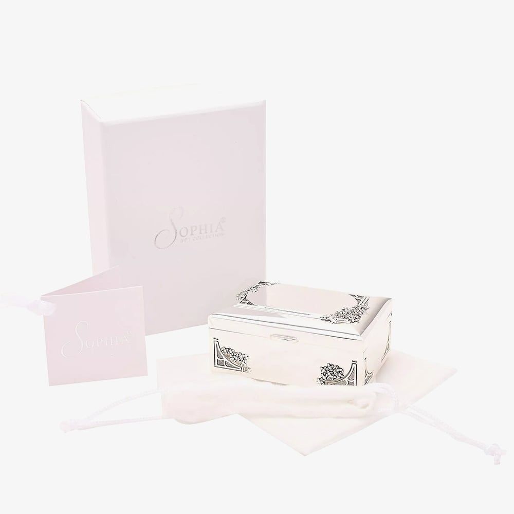 Store your cherished keepsakes in style with this elegant silver-plated rectangular trinket box from SOPHIA®. Featuring a polished silver finish and an engraving plate, it’s perfect for a personalised message. Ideal for holding jewellery or treasured mementoes, this trinket box makes a sweet gift for a loved one.