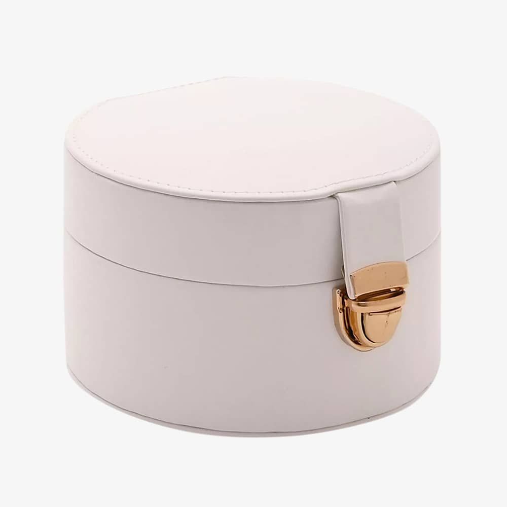 This jewellery box features a convenient lift-up fastening clasp for secure closure with a mirrored lid, perfect for quick checks before stepping out. Crafted from high-quality PU leather the inside contains five compartments, including a ring roll, all adorned with a luxurious cream lining to pamper your precious pieces.