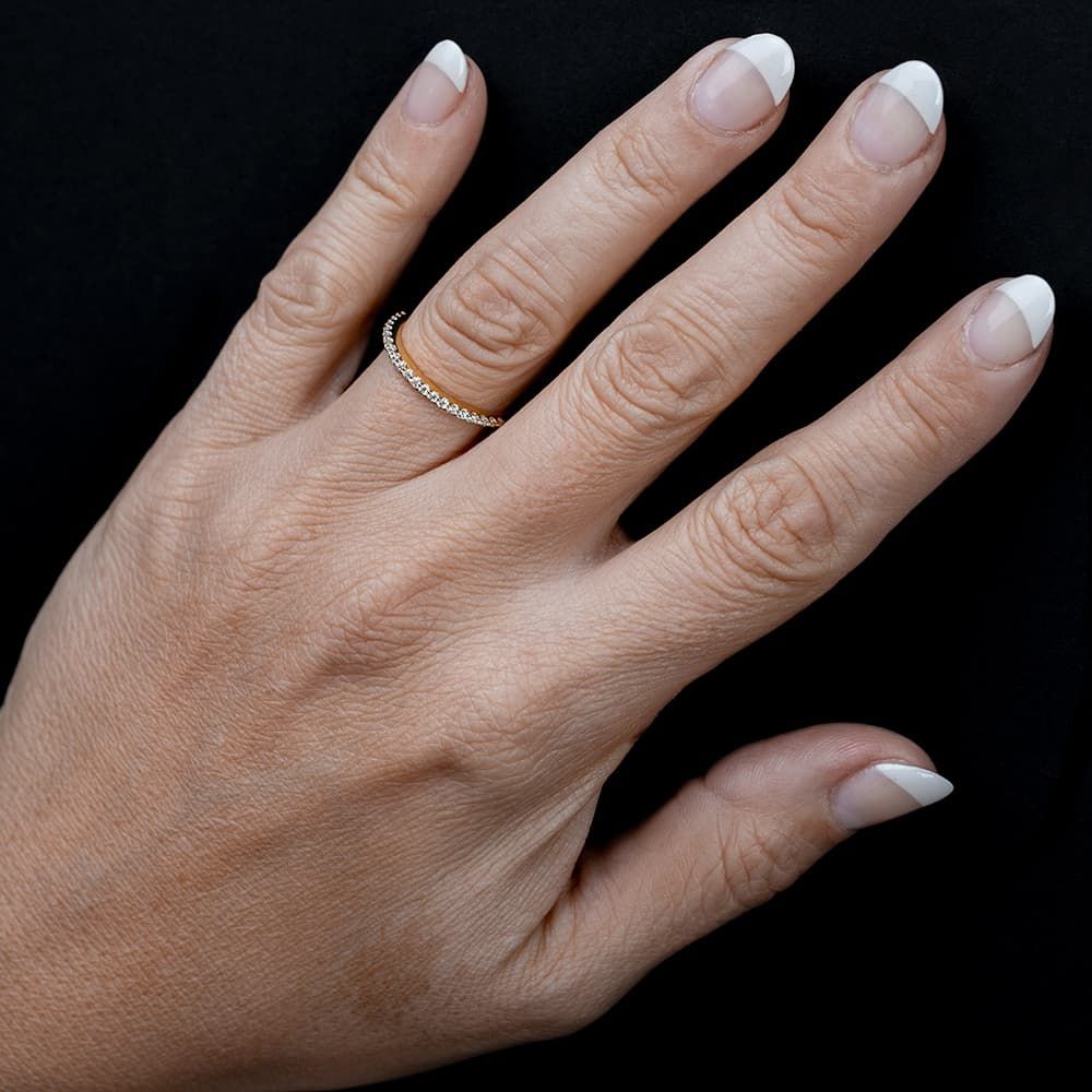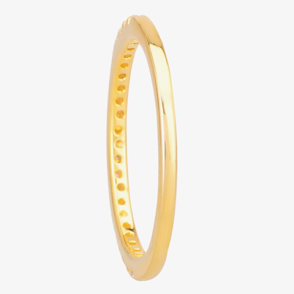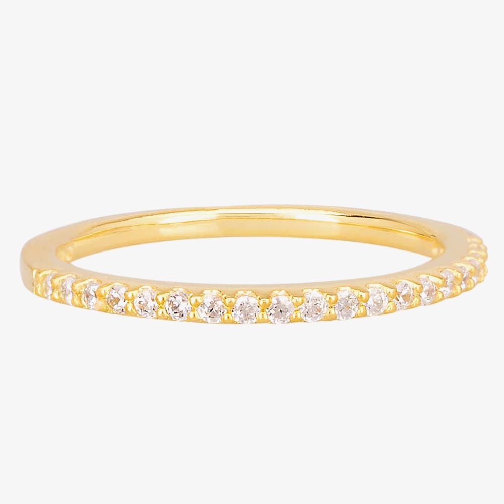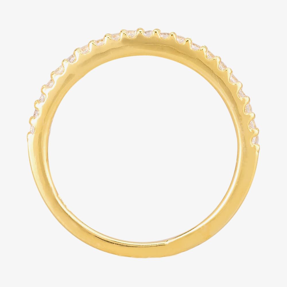 Shimmering pavé in textured four-claw settings grace the front of this handcrafted half-eternity ring, perfectly complementing the high polished finish to the bright and inviting gold-plating.