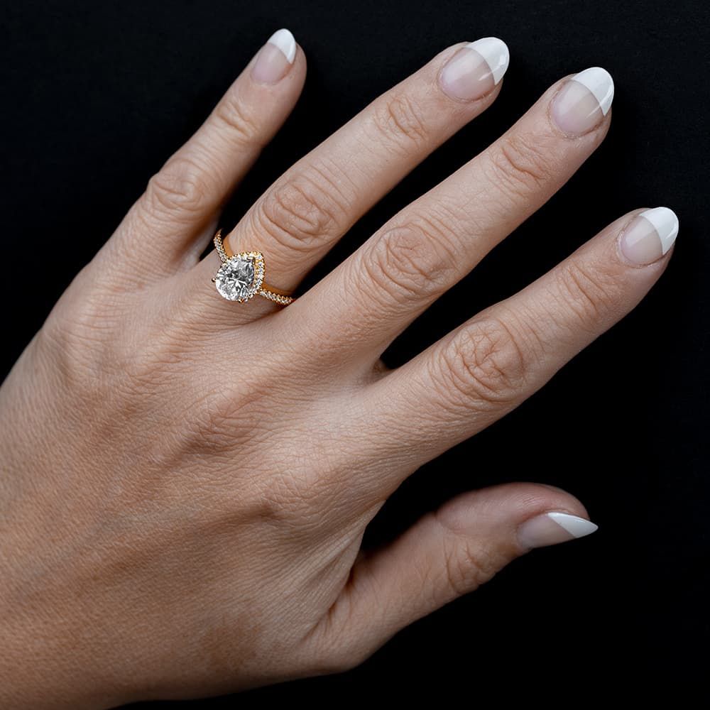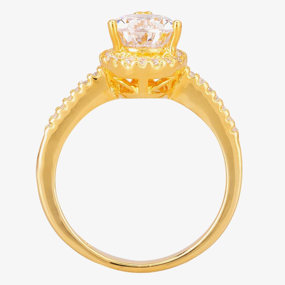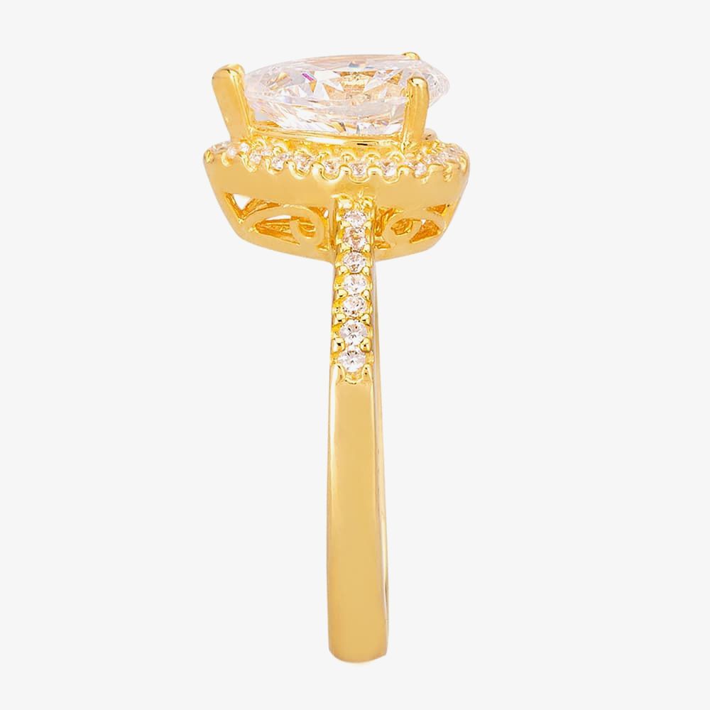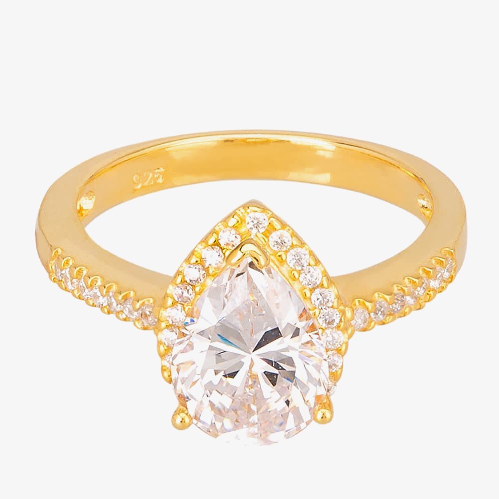A pear-cut cubic zirconia stone is framed with delicate pavé to add a touch of shimmer to your wardrobe as the focus of this handcrafted gold-plated ring. The built-up pavé shoulders meet the cut-out raised mount just below the halo to ensure this ring sits high on the finger.