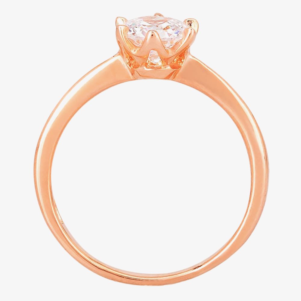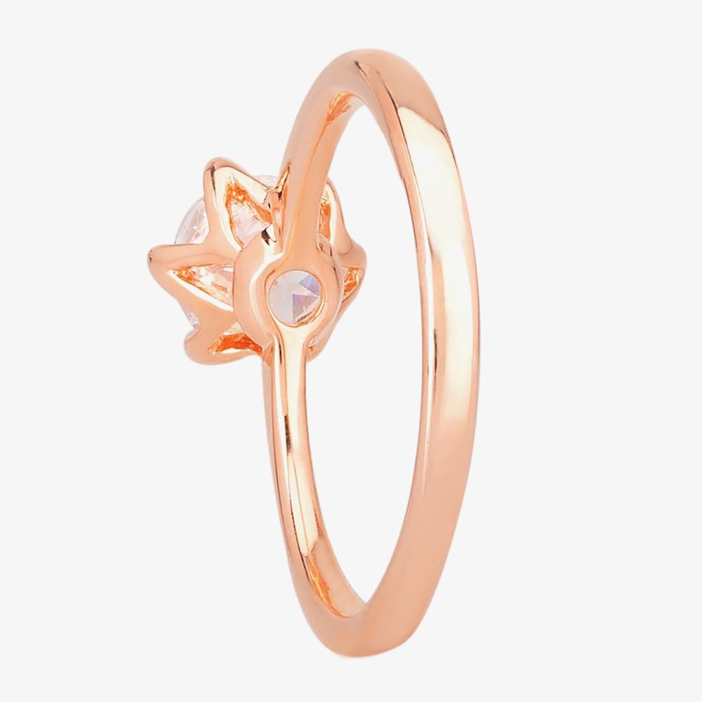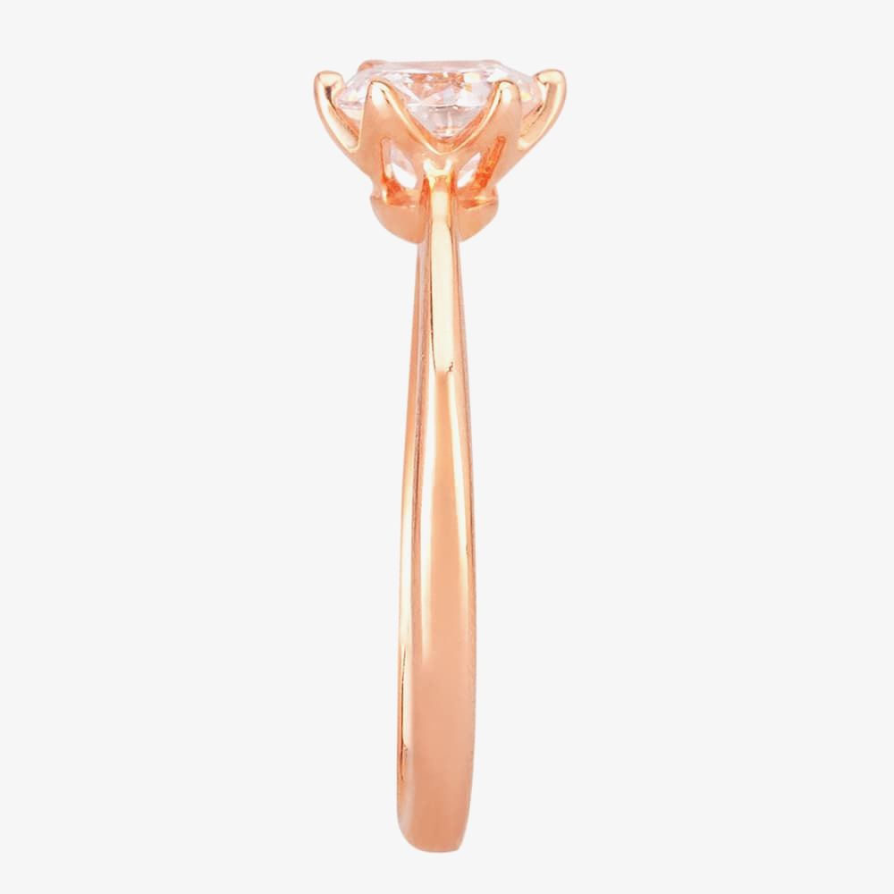 A beautifully faceted brilliant-cut cubic zirconia stone is securely held in a contemporary six-claw arched basket setting, perfect for ensuring the maximum amount of light can enter the stone to ensure radiance and shimmer. Solid shoulders climb halfway up the mount for additional support to make this bright rosy-hued ring a perfect centrepiece for a ring stack.