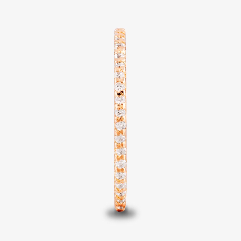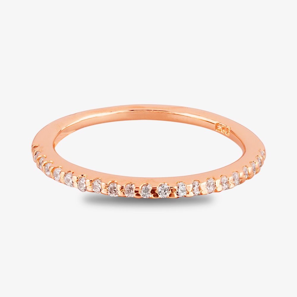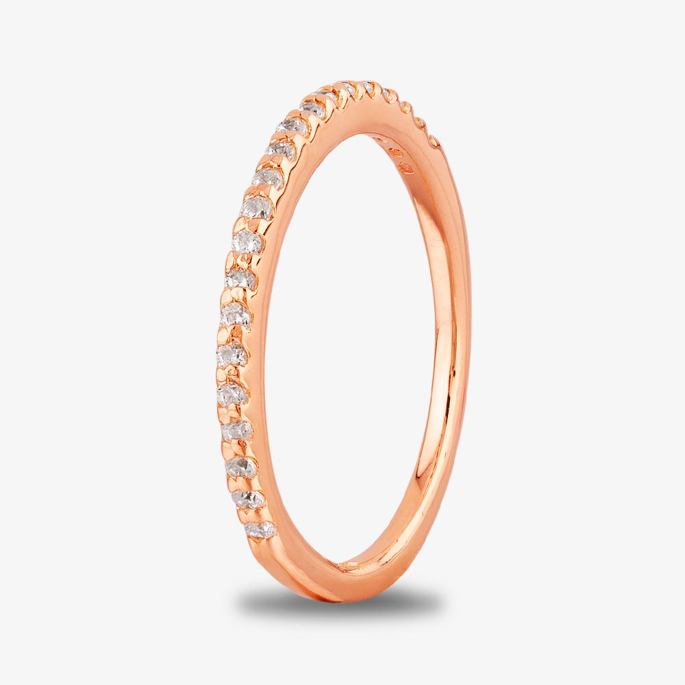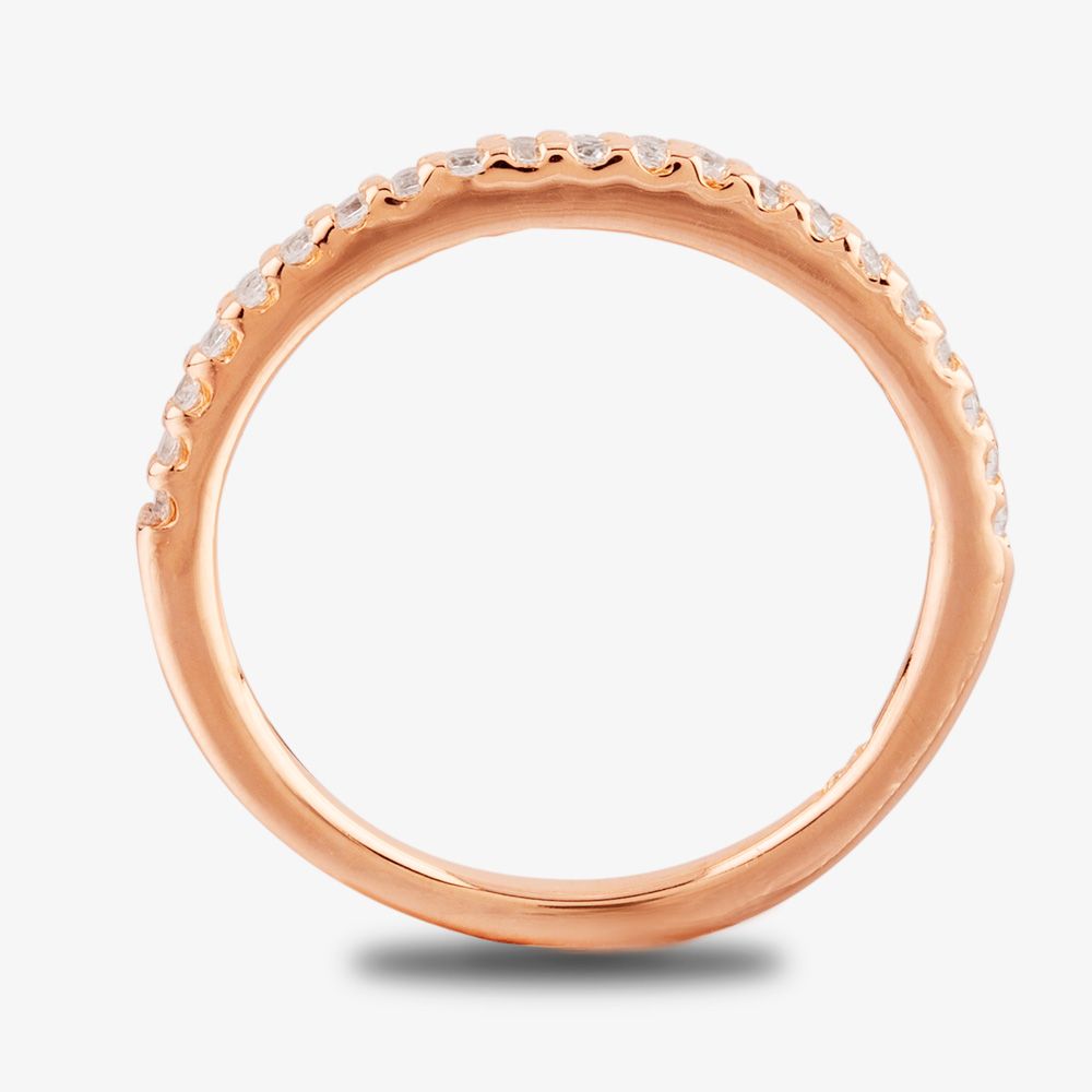 Shimmering pavé in textured four-claw settings grace the front of this handcrafted half-eternity ring, perfectly complementing the high polished finish to the warm and welcoming rose gold-plating.