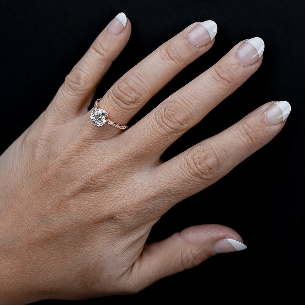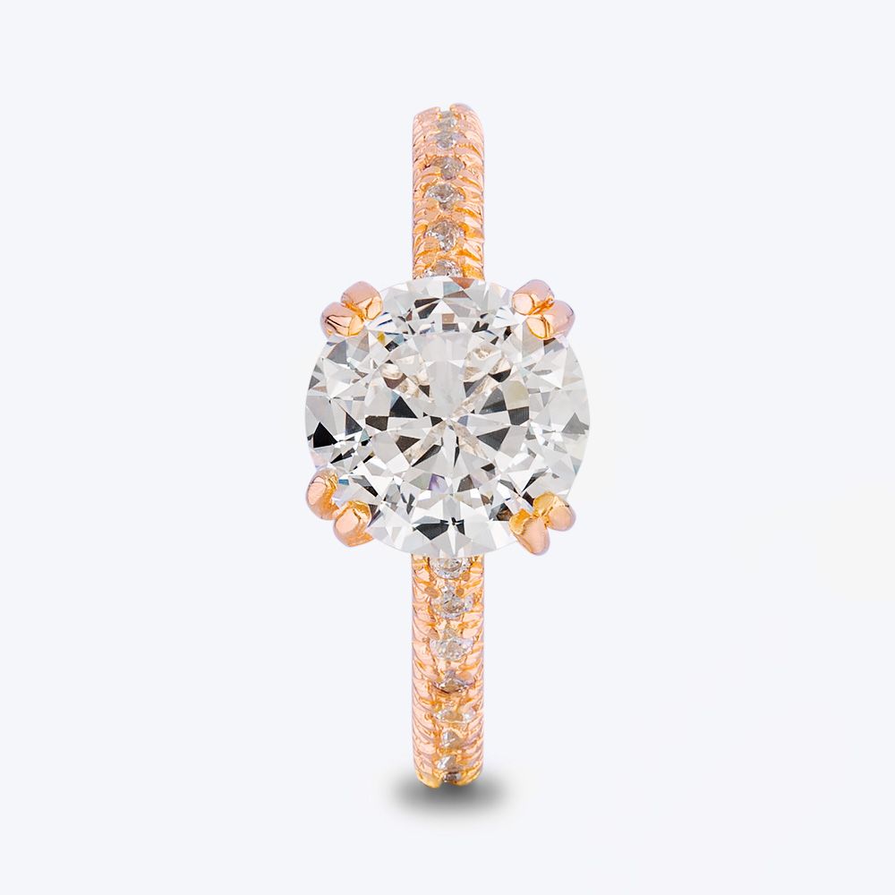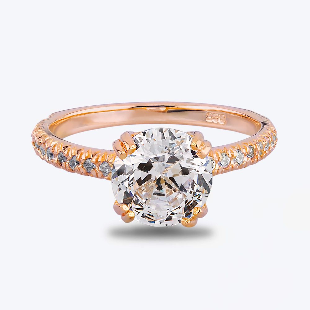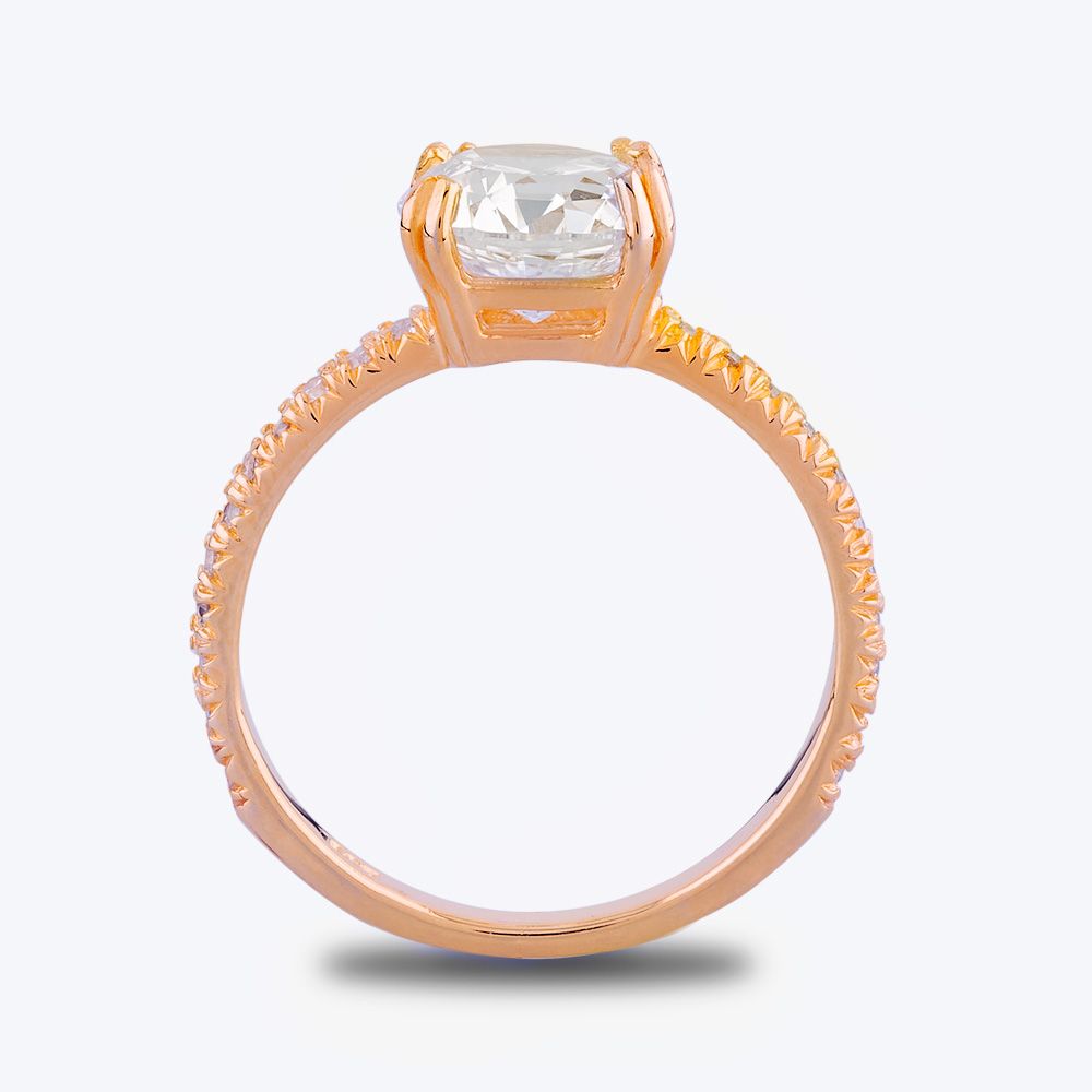 A beautifully faceted cushion-cut stone sits in a double claw basket setting seamlessly integrated into the warm and inviting rose gold-plated shank. Pavé-set stones cover two-thirds of the band to enhance the impact of the centre stone.