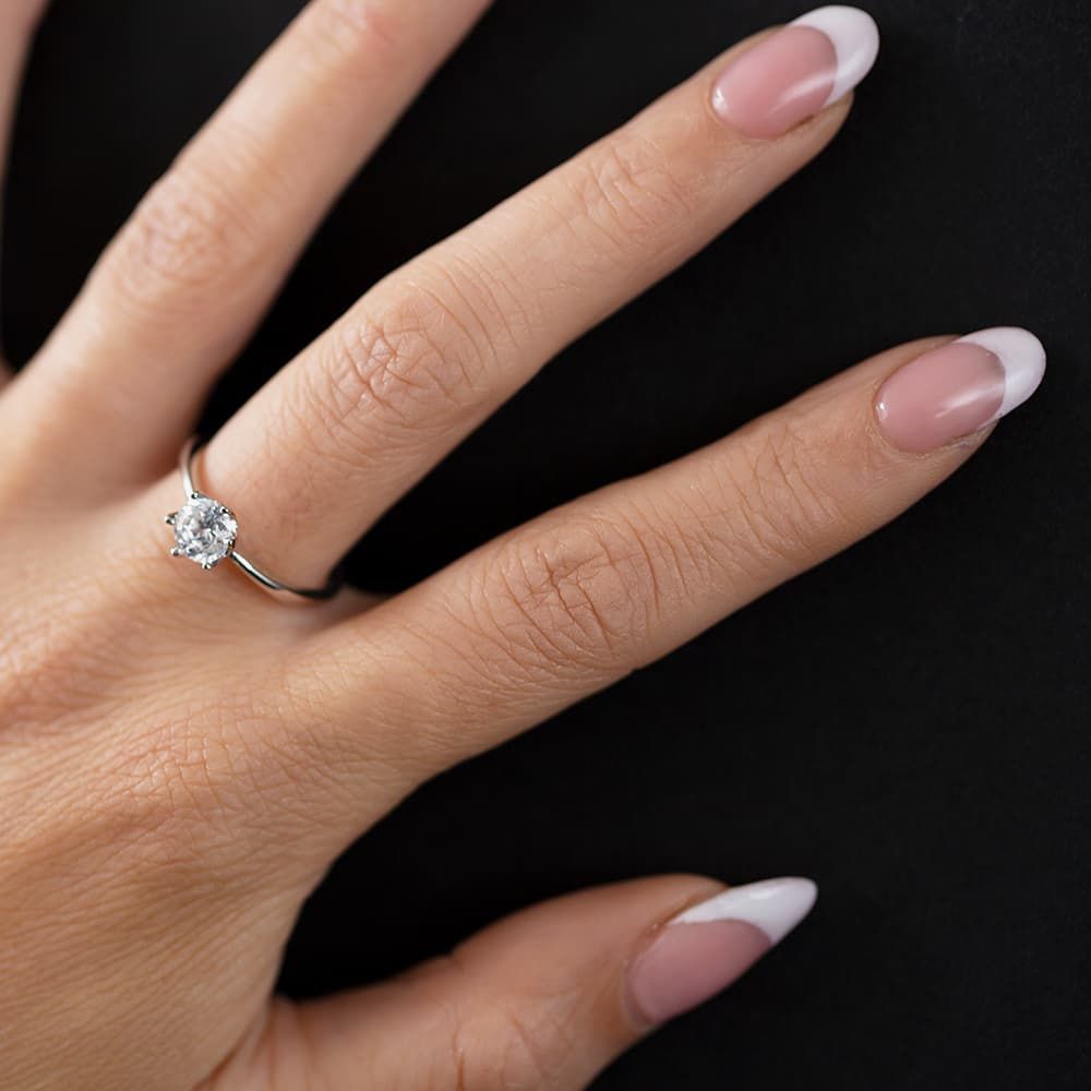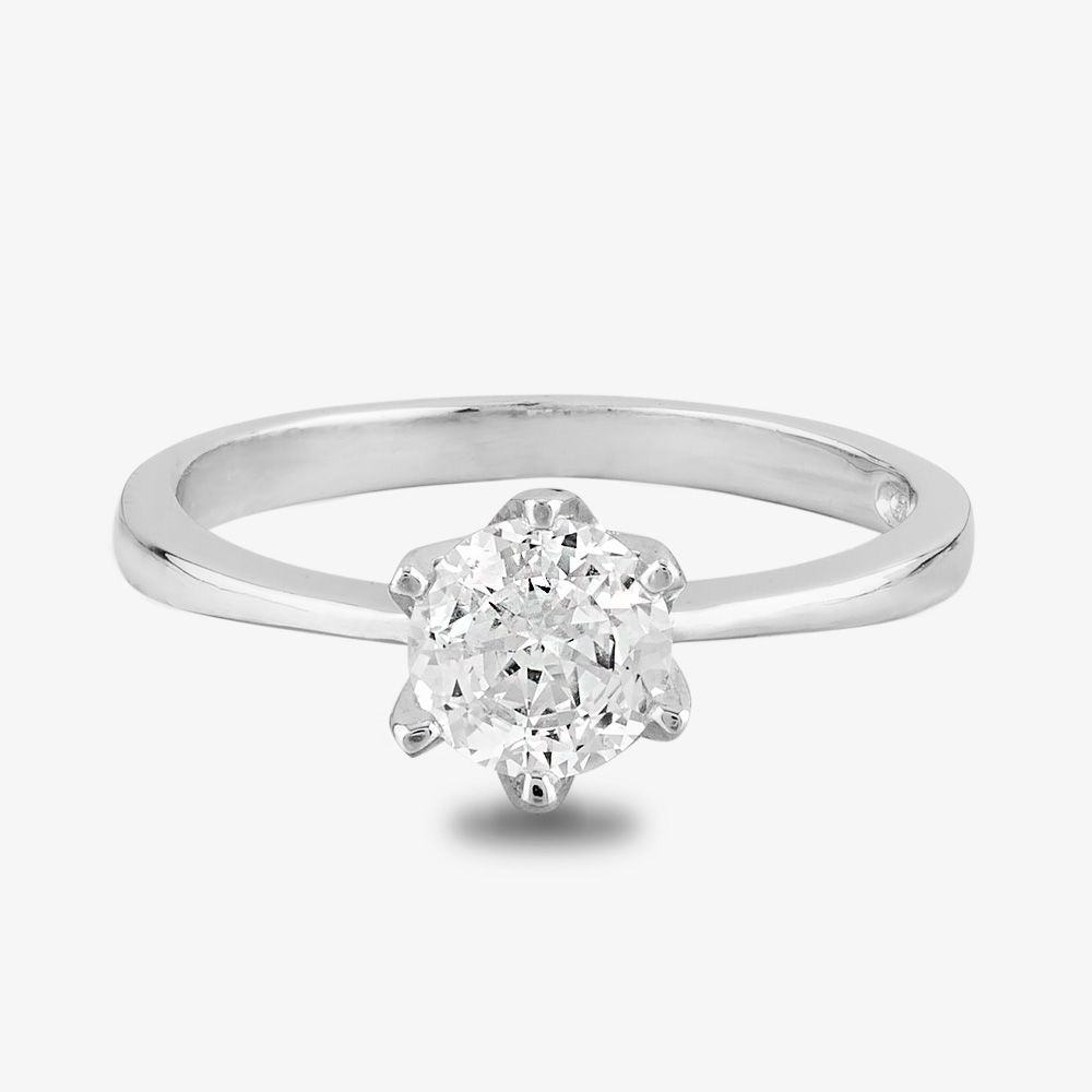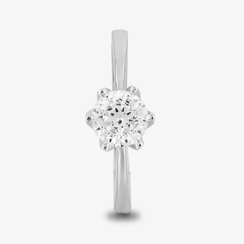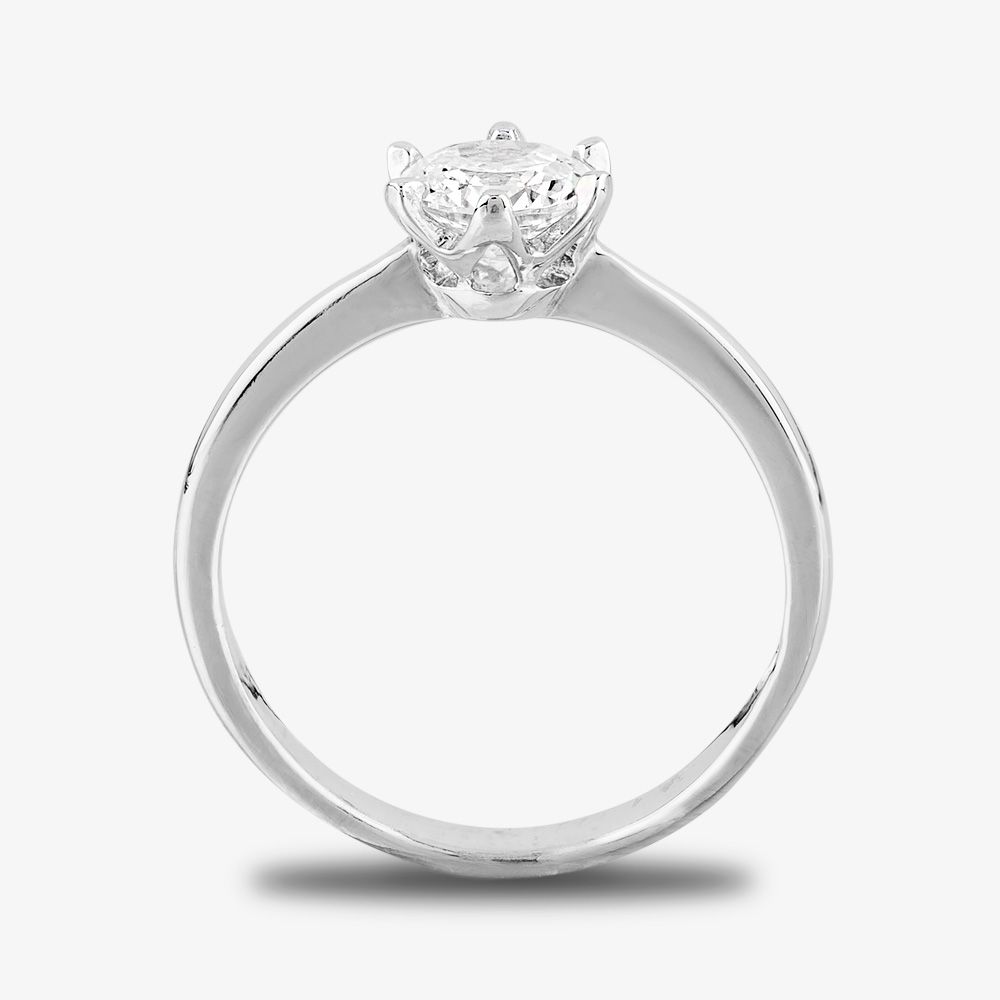 A beautifully faceted brilliant-cut cubic zirconia stone is securely held in a contemporary six-claw arched basket setting, perfect for ensuring the maximum amount of light can enter the stone to ensure radiance and shimmer. Solid shoulders climb halfway up the mount for additional support.