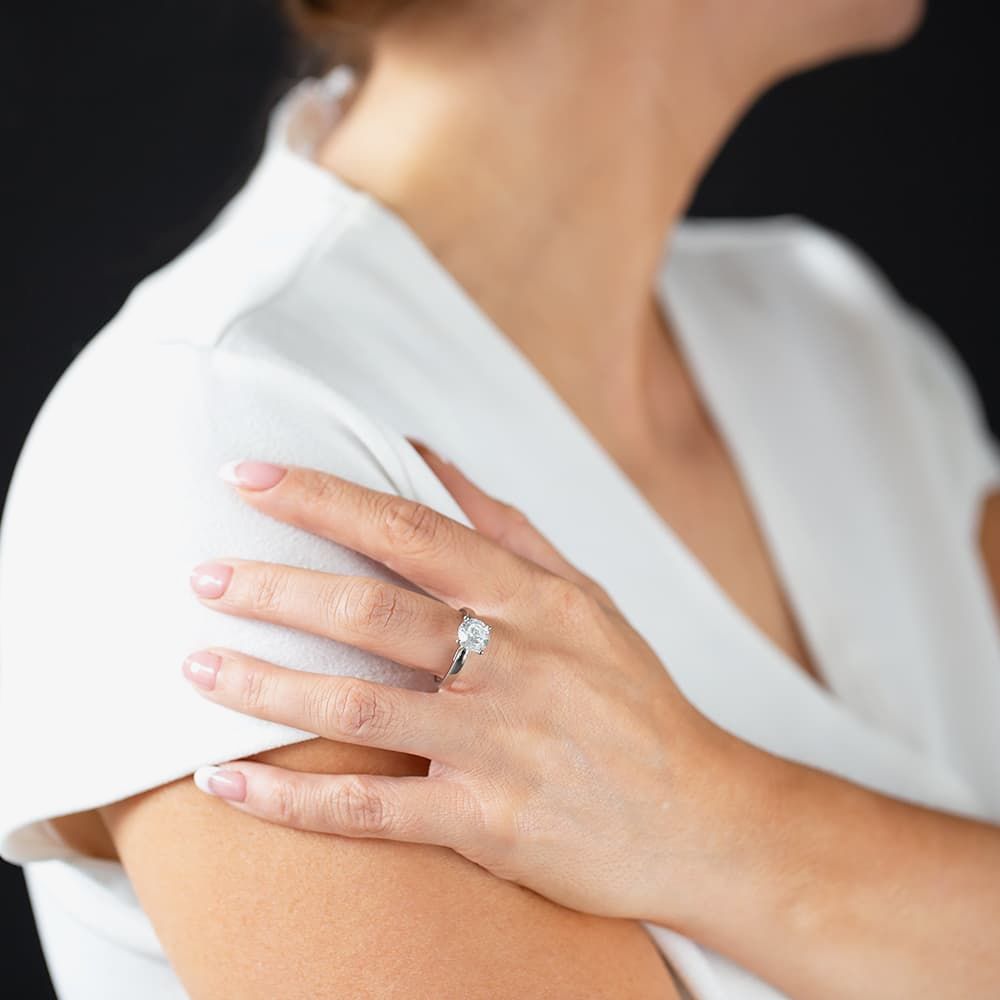 A beautifully faceted brilliant-cut cubic zirconia stone is securely held in a traditional four-claw setting, perfect for ensuring the maximum amount of light can enter the stone to ensure radiance and shimmer. The setting is further stabilised with open shoulders to allow the light to penetrate from a multitude of angles.