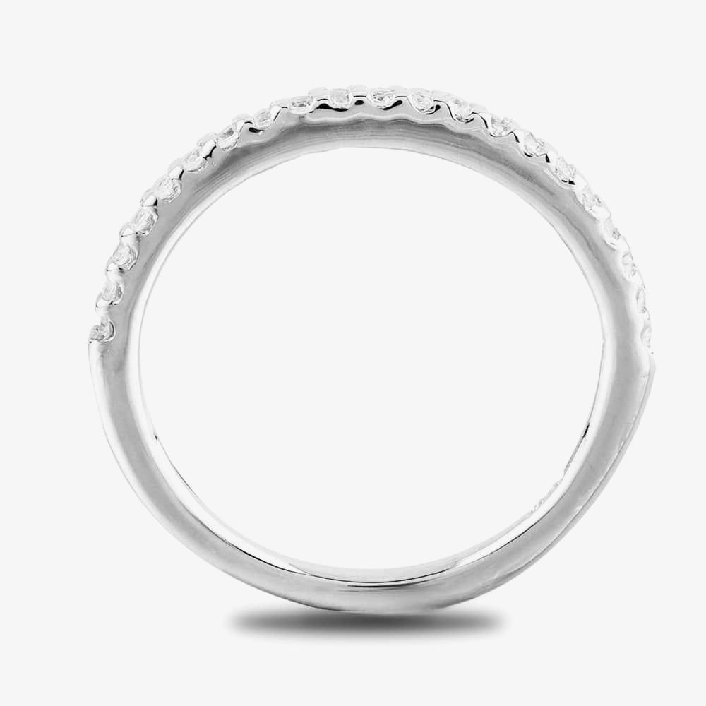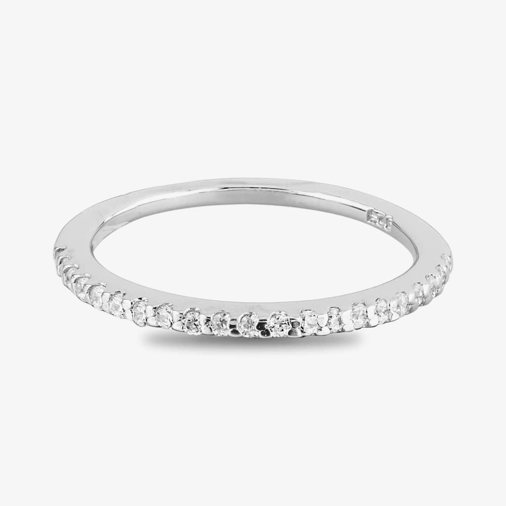 Shimmering pavé in textured four-claw settings grace the front of this handcrafted half-eternity ring, perfectly complementing the high polished finish to the sterling silver.