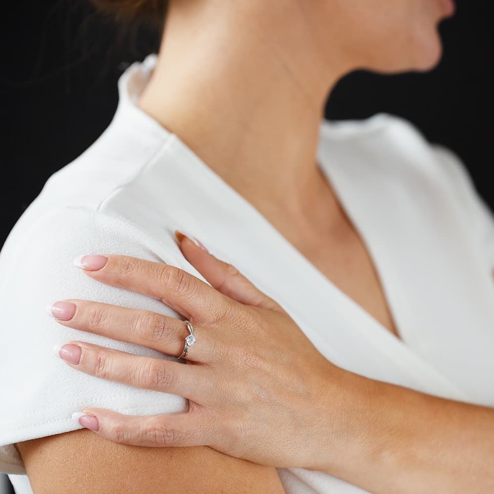 A beautifully faceted brilliant-cut cubic zirconia stone is securely held in a traditional four-claw setting, perfect for ensuring the maximum amount of light can enter the stone to ensure radiance and shimmer. The setting itself is twisted to align with the cardinal directions to add a contemporary feel, further bolstered by additional shoulder detailing reminiscent of vine leaves to create a dipped band finish.