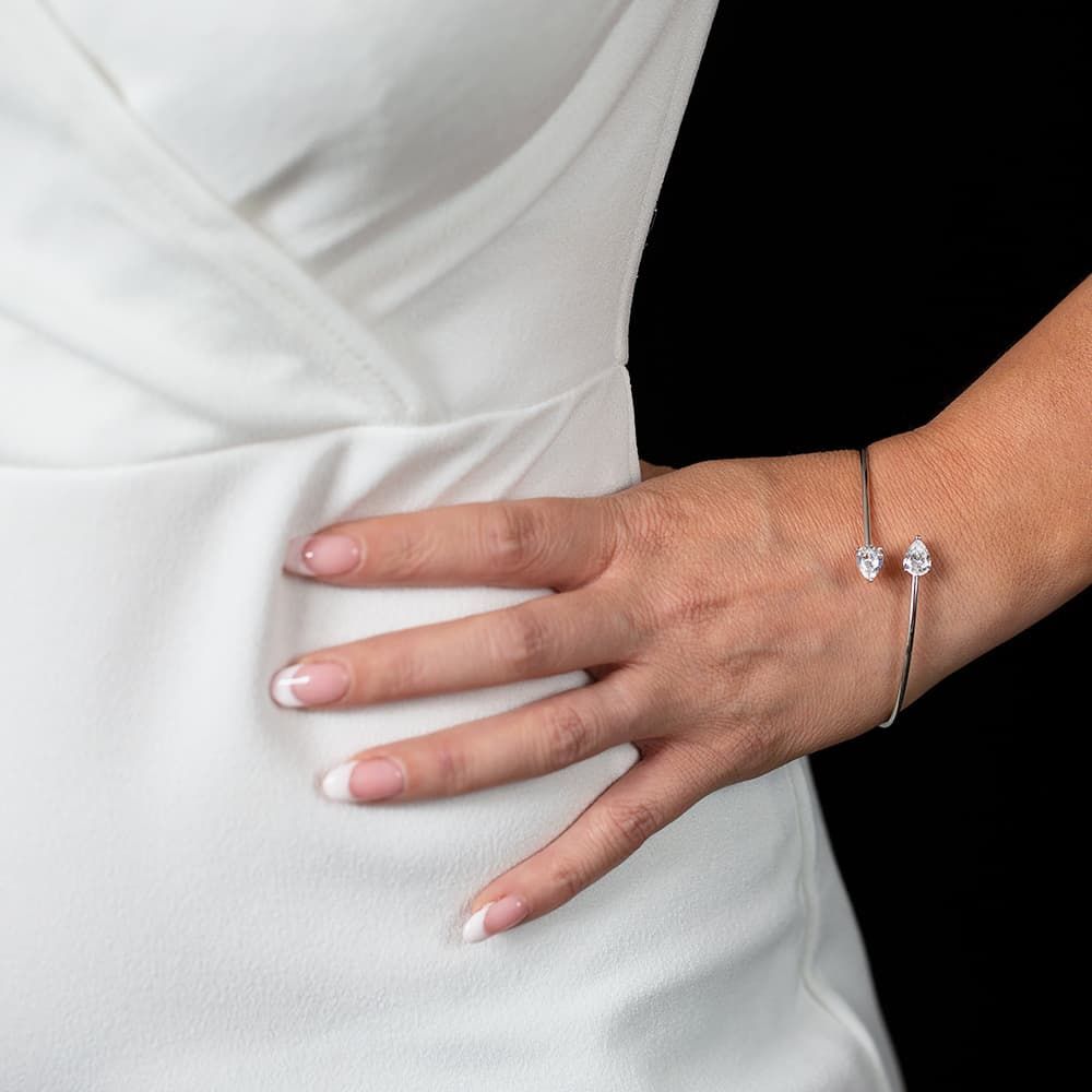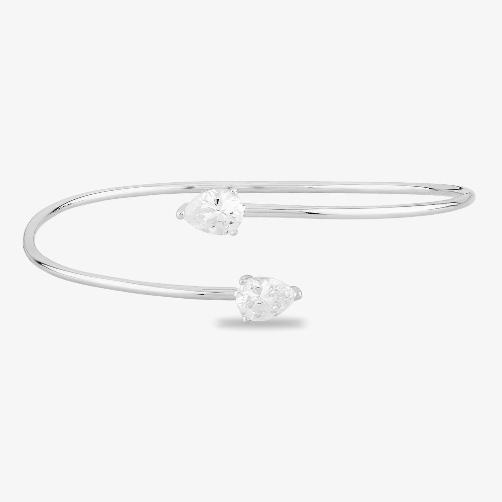 Twin pear-cut cubic zirconia stones add a touch of shimmer to this handcrafted sterling silver open bangle. Rounded for comfort and rigid enough to hold its shape, this costume piece is perfect for shopping trips or nights on the town.