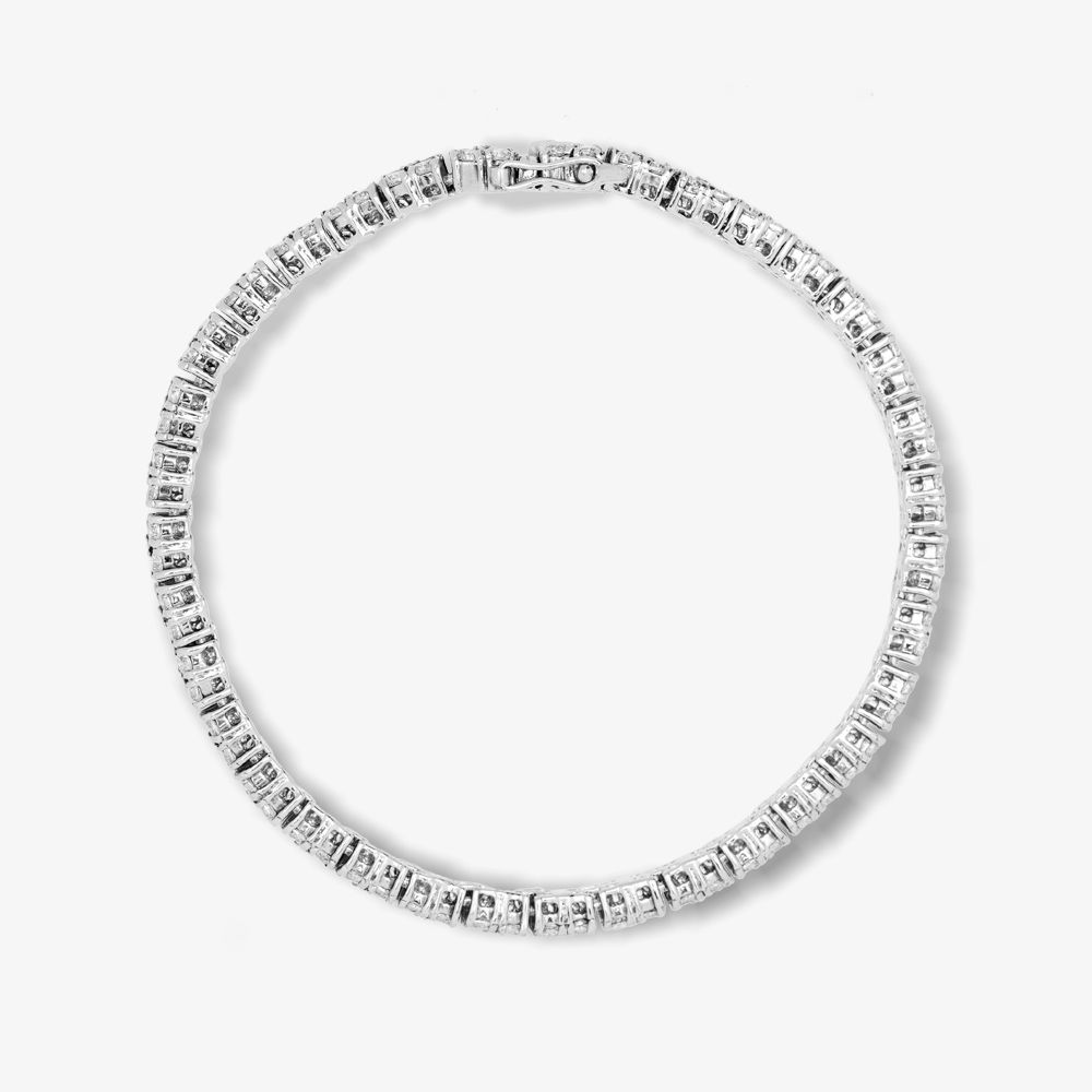 This contemporary twist on the traditional 7.5" sterling silver tennis bracelet showcases four round cubic zirconia stone four-claw set into quad links. Fully articulate and fastened with a secure latch clasp, this piece is perfect for formal events and nights out with the girls.