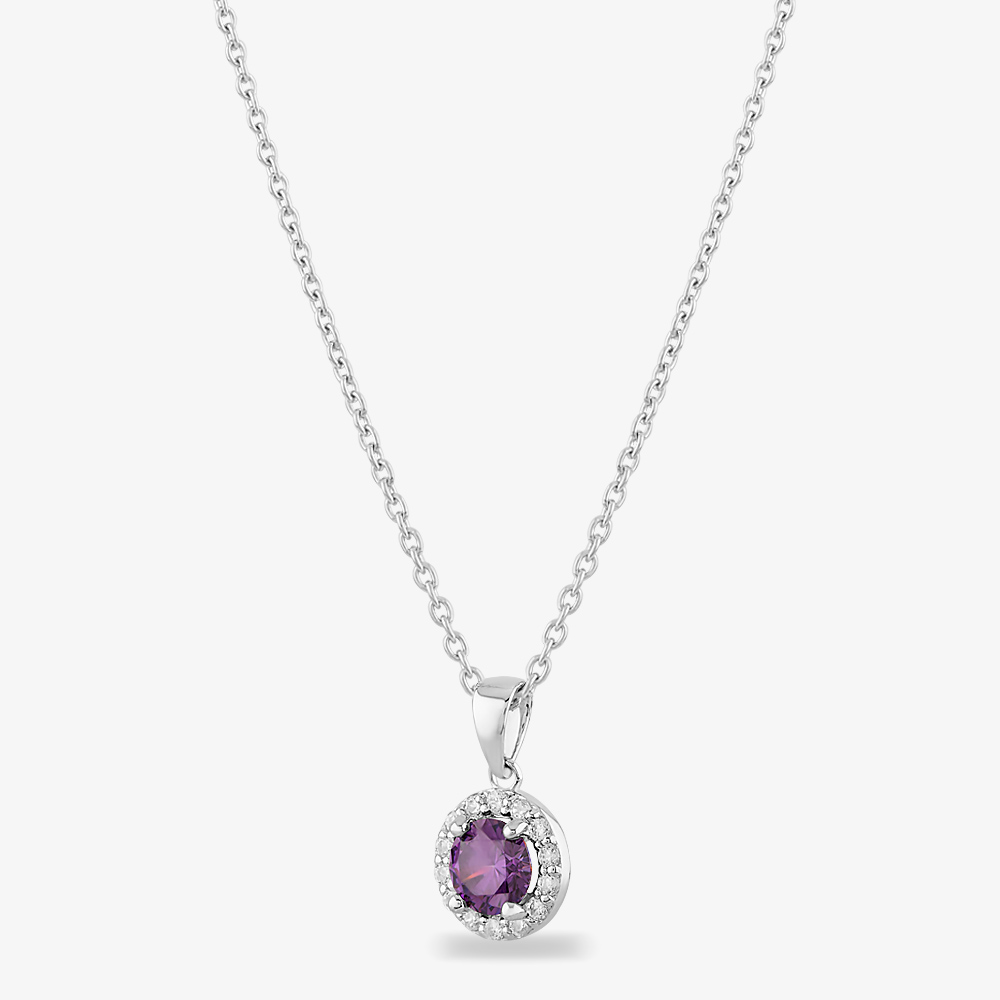 The Starbright Sterling Silver Cubic Zirconia Halo Pendant Necklace P8210 AM is created from Sterling Silver and features a beautiful purple cubic zirconia stone with a dazzling white cubic zirconia halo.