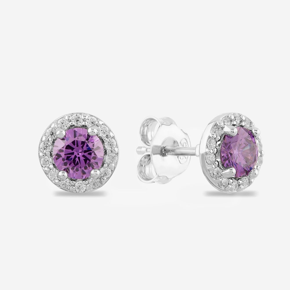 The Starbright Sterling Silver Cubic Zirconia Halo Stud Earrings E442 AM are created in Sterling Silver and feature beautiful purple cubic zirconia stones with dazzling white cubic zirconia halos.