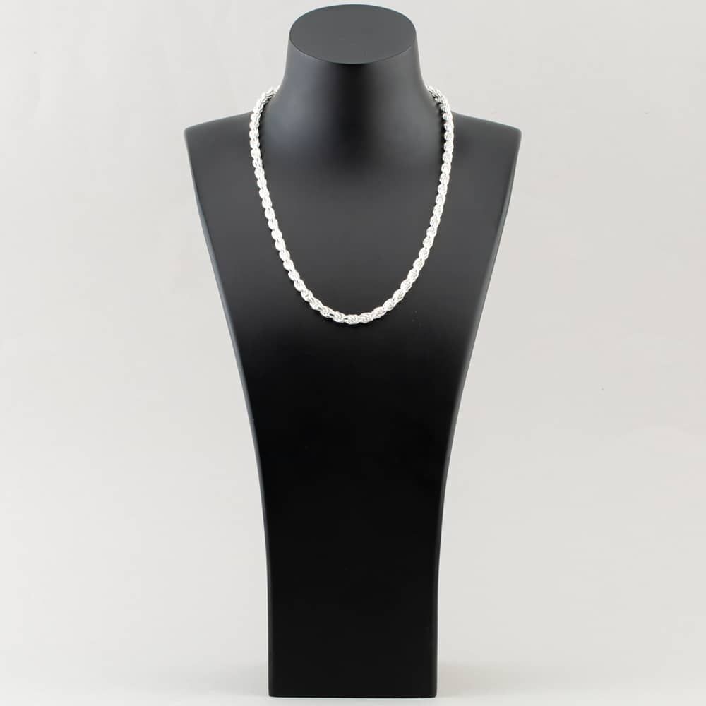 This sterling silver 20-inch rope chain necklace features a bold, twisted design with interwoven links, creating a striking and dynamic texture. The thick construction adds a substantial feel, making it a statement piece that stands out. The polished sterling silver finish enhances its shine and elegance, while the sturdy design ensures lasting durability. Perfect for wearing alone or with a pendant, this necklace offers a timeless and versatile addition to any jewellery.