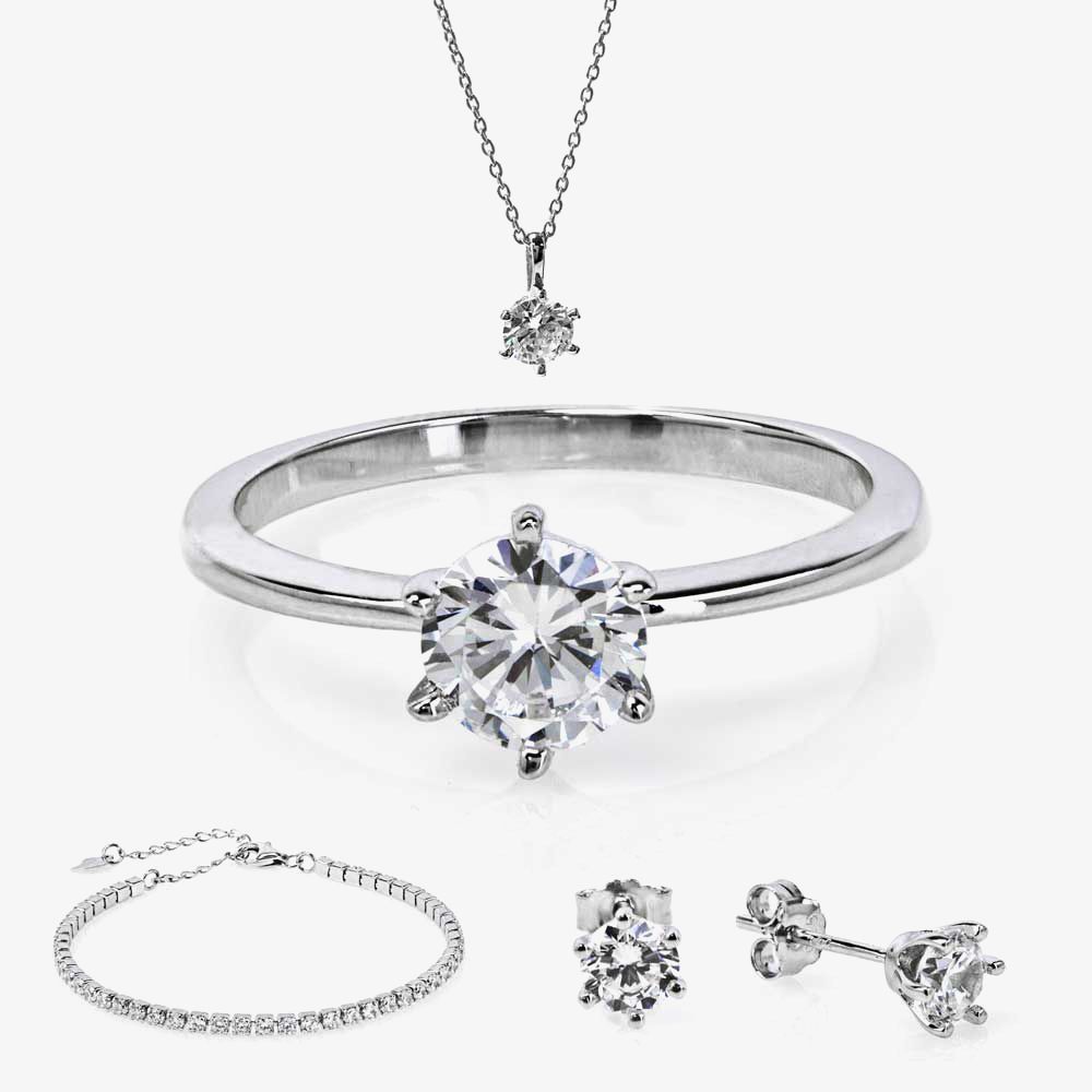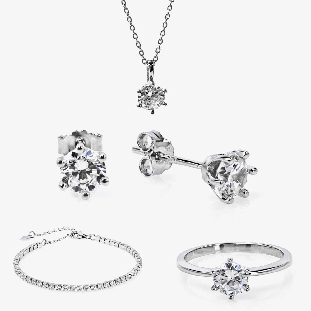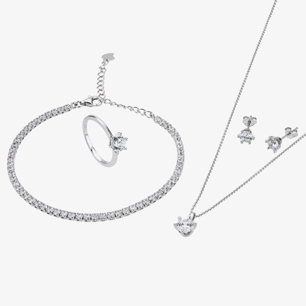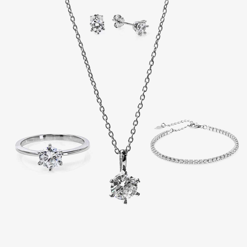 Adorn your outfits with this dazzling jewellery set and sparkle in style, a wonderful gift for yourself or a loved one this season. Crafted from sterling silver in a stylish 6 claw design, adorned with sparkly cubic zirconia. Encompassing glitz and glamour at a great price this set includes pendant, chain, earrings, ring and tennis bracelet. Buy with confidence