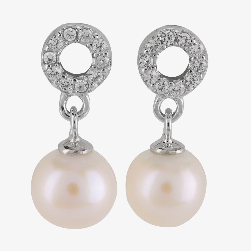 Pretty pearls are strung from halos of cubic zirconia to create these elegant droppers.