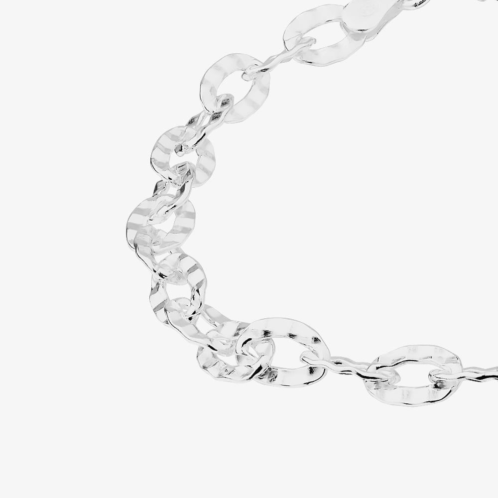 Crafted from recycled sterling silver, this bracelet features a subtle yet captivating rippled texture on each link, adding a touch of elegance to any outfit. Whether worn solo for a minimalist look or layered with other pieces for extra depth, this chain bracelet is a versatile accessory that enhances any style. Complete your look by pairing it with the matching necklace.