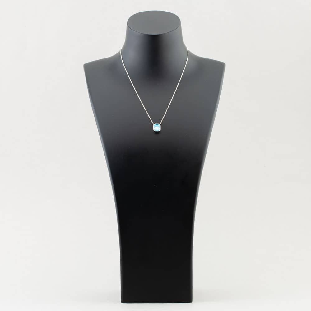Crafted in sterling silver and an eye catching aquamarine coloured blue crystal, this necklace features an extendable length of 41cm-46cm and can be paired with the matching earrings for a complete set.