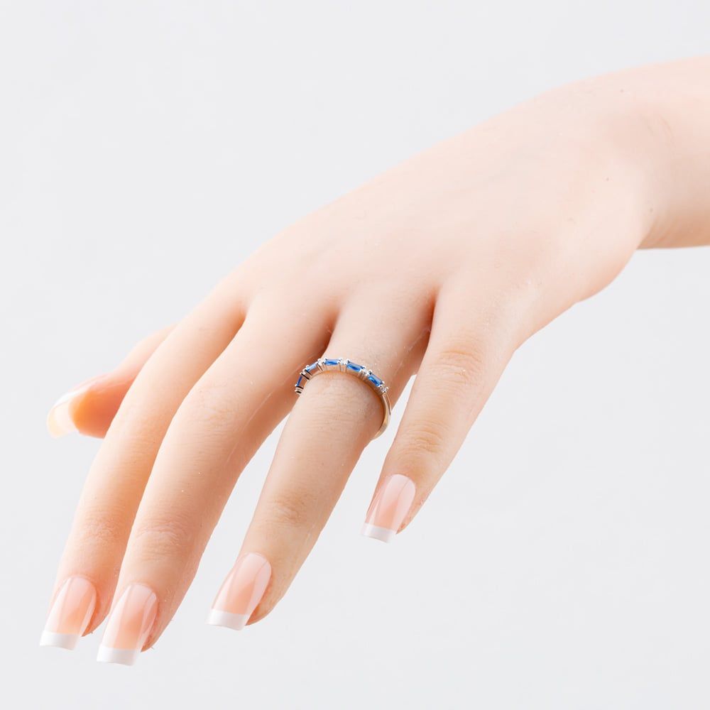 A sleek sterling silver half eternity ring featuring striking blue baguette-cut cubic zirconia stones, elegantly alternating with brilliant-cut white cubic zirconia stones. This modern design offers a vibrant pop of colour paired with timeless sparkle.