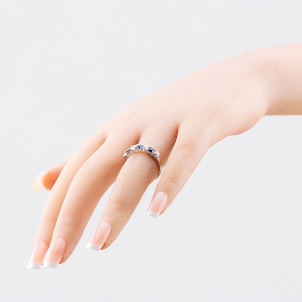 This elegant sterling silver half eternity ring features seven brilliant-cut cubic zirconia stones, alternating between sparkling white and vibrant blue hues. The dazzling arrangement creates a striking contrast, perfect for adding timeless sparkle and colour to any outfit.