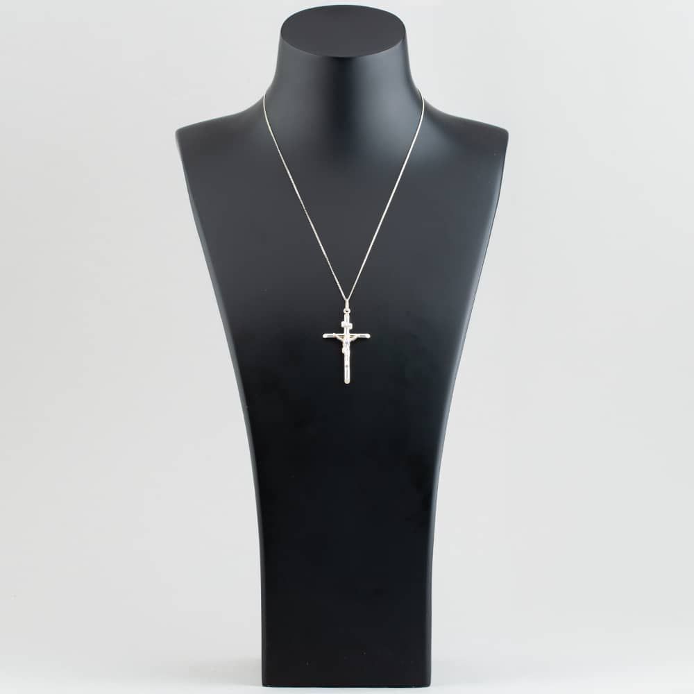 This sterling silver necklace features a 1.1mm polished panza curb chain that beautifully suspends a crucifix large pendant. A simplistic, yet beautiful necklace.
