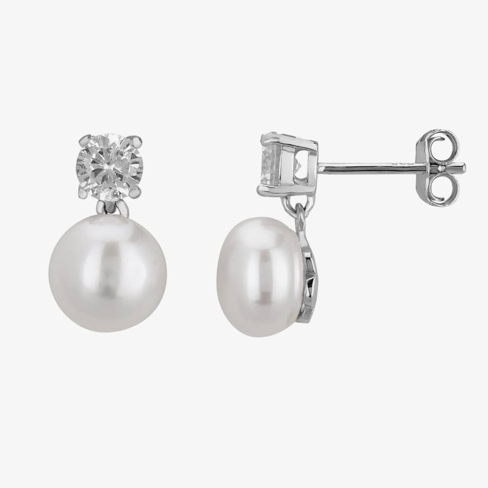 Crafted in sterling silver, these beautiful earrings feature a 4 claw set cubic zirconia stone with a free moving pearl dropper.