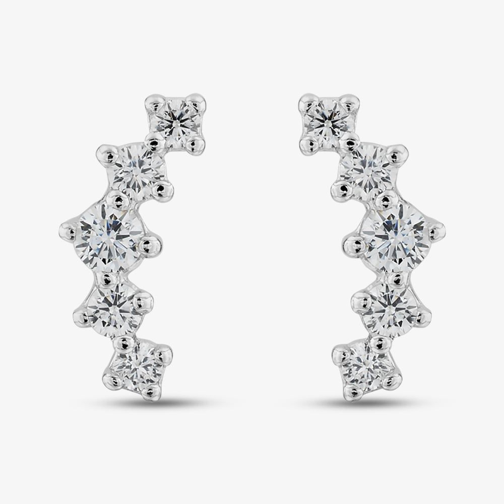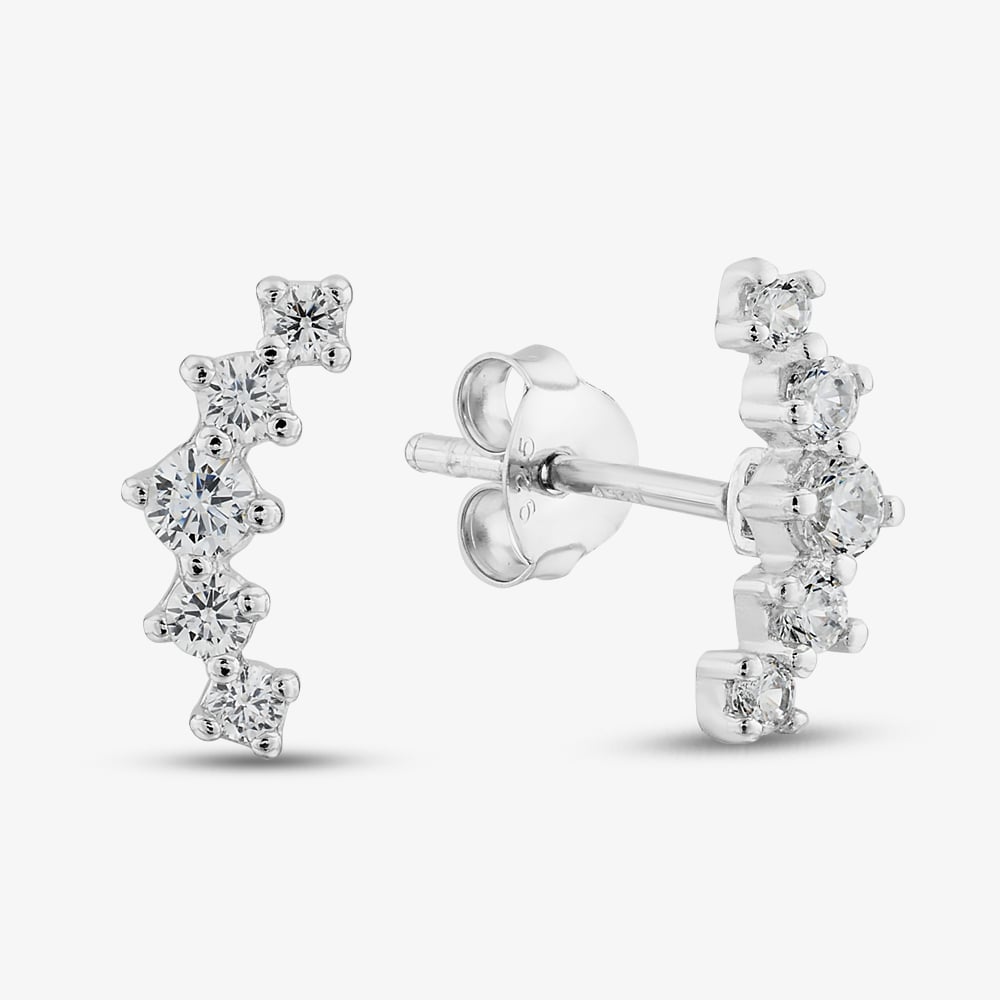 These curved bar stud earrings, crafted in sterling silver with rhodium plating and graduated cubic zirconia stones, are perfect for stacking with other studs. A sparkling addition to any jewellery collection, they effortlessly enhance your look with a touch of shine.