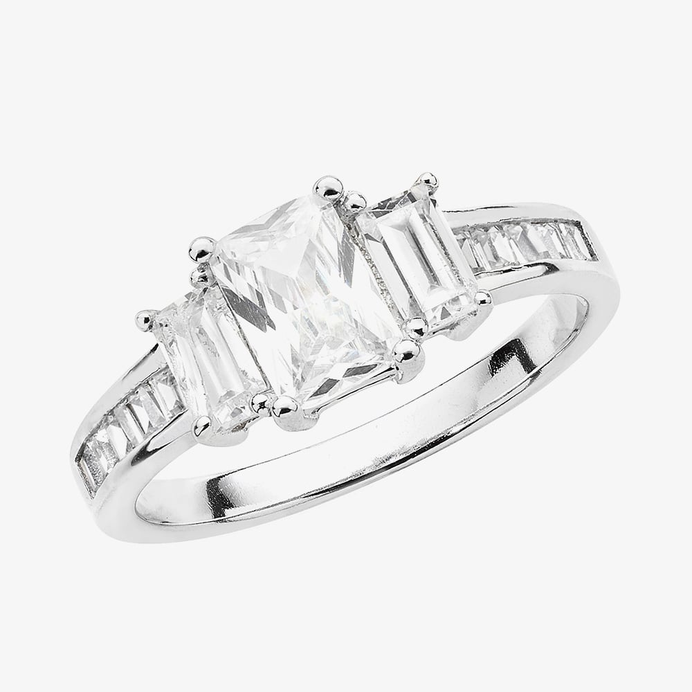 This stunning sterling silver dress ring features three emerald-cut white cubic zirconia centre stones, elegantly flanked by smaller shoulder-set cubic zirconia. Sophisticated and sparkling, it’s the perfect statement piece for special occasions or adding glamour to everyday wear.
