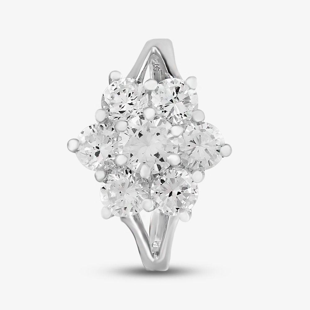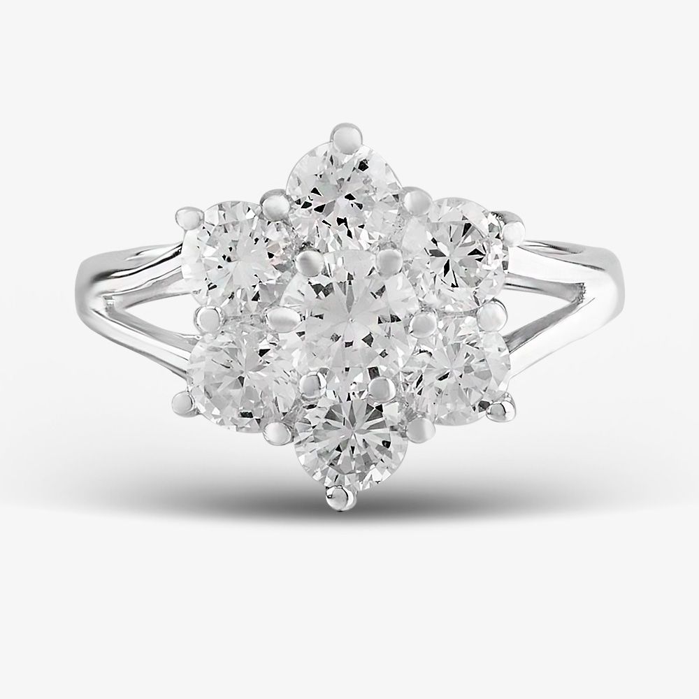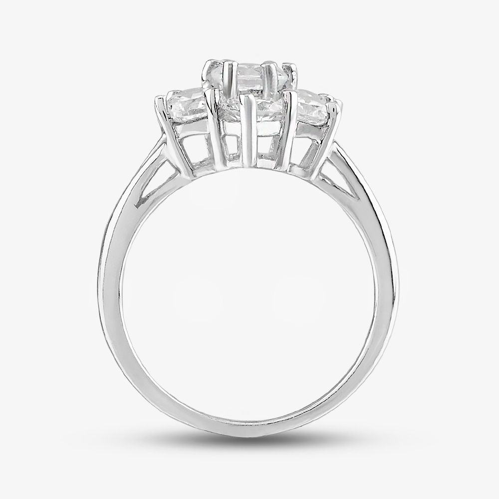 This sparkling steling silver dress ring has been crafted with seven glistening round cubic zirconia stones secured with claw settings along with an fancy open shoulder design. The perfect dress ring for that special occasion.