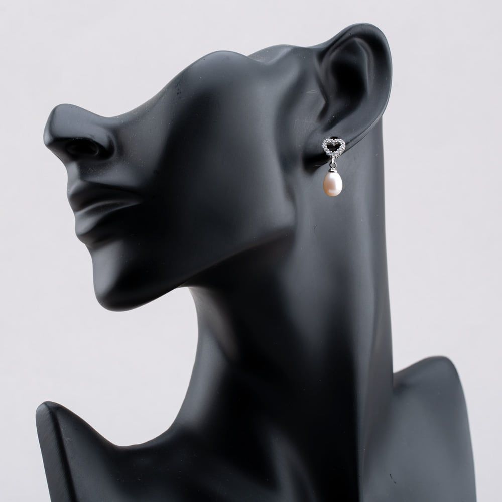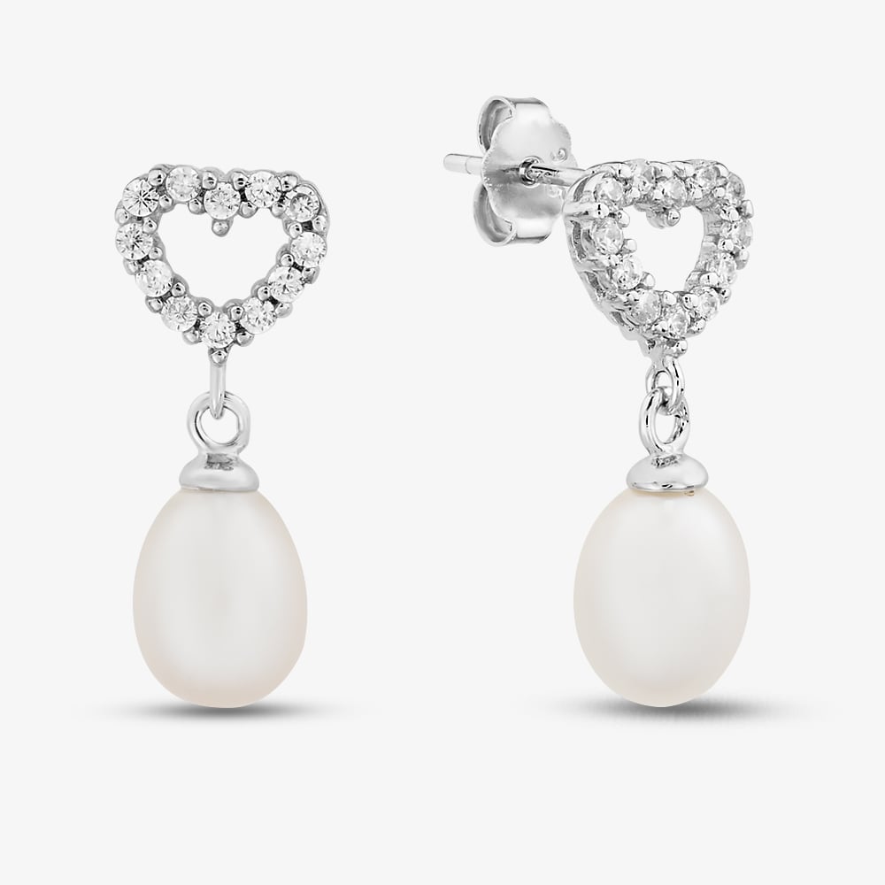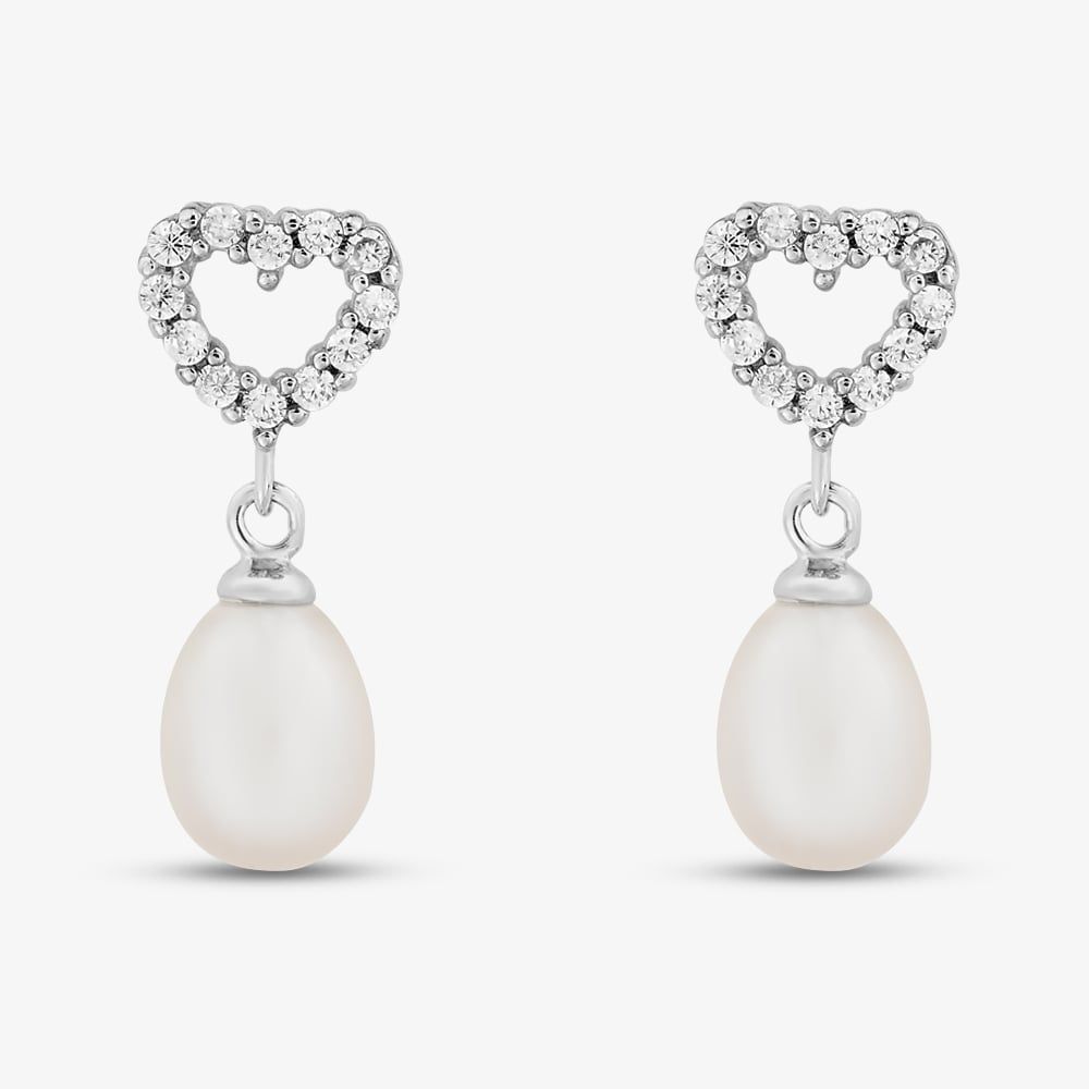 Crafted from radiant sterling silver, open heart shaped motifs are adorned with sparkling cubic zirconia stones. A lustrous freshwater pearl is suspended below, creating a dropper style pair of earrings perfect for elevating your evening outfits. Complete with post and butterfly fastenings for a secure fit, this earrings are great for gifting or adding to your own collection.