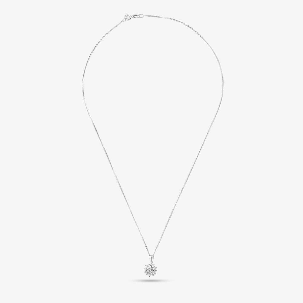 This classic necklace has been crafted in sterling silver and features a round cluster design set with sparkling cubic zirconia stones which shimmer and catch the light beautifully. This traditional necklace is accompanied with an 18-inch curb link chain with a bolt ring fastening. The ideal stand-alone piece or perfect for layering with other necklaces or pendants to create your own unique look.