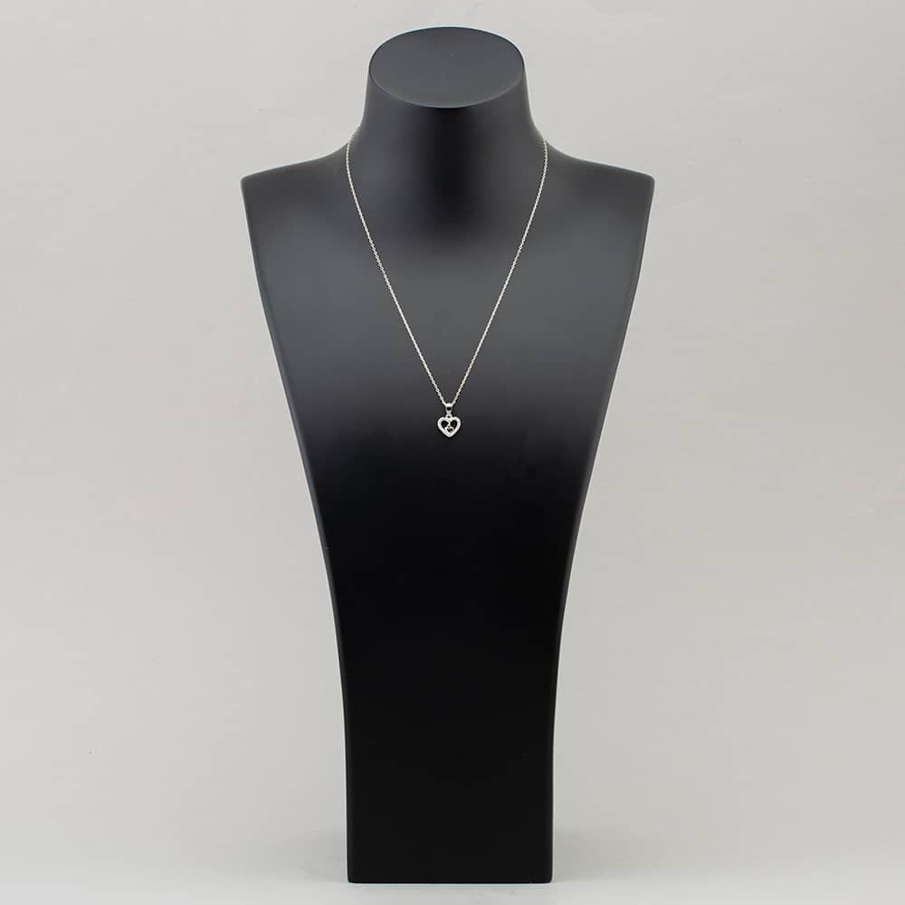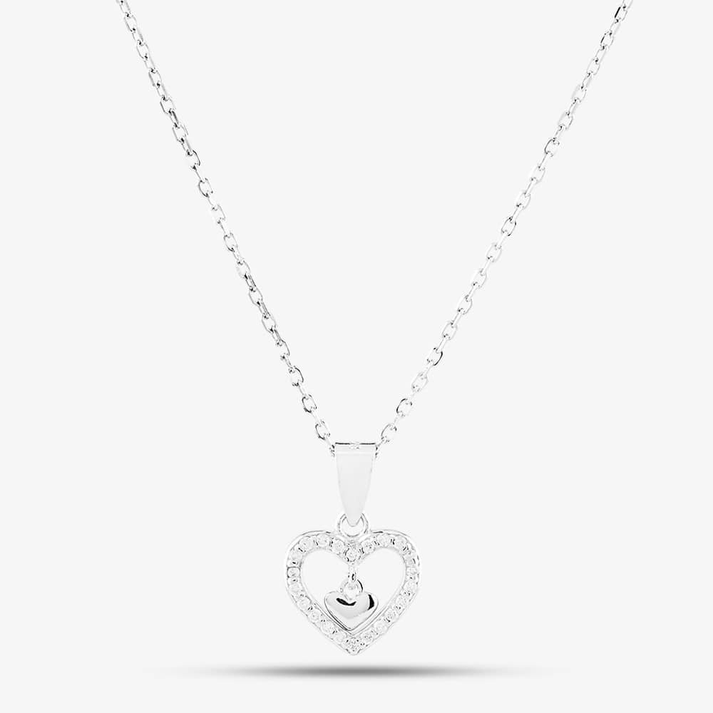 A pretty sterling silver pendant composed of two hearts one inside the other. It is presented on a belcher chain and the larger heart is also set with sparkling white cubic zirconia stones.