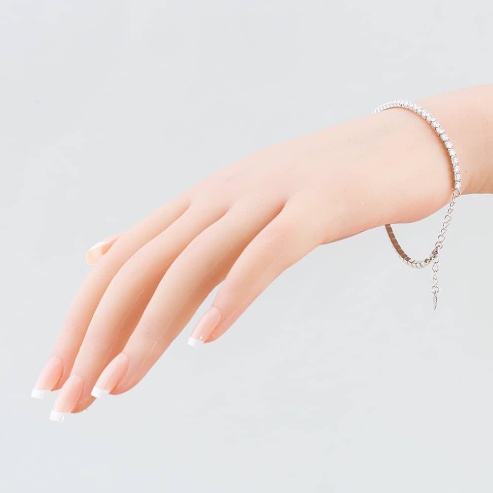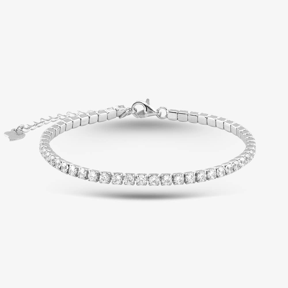 This minimalist sterling silver bracelet features a row of sparkling cubic zirconia stones, adding a touch of glamour to any outfit. The adjustable trace chain ensures a comfortable fit for any wrist size.