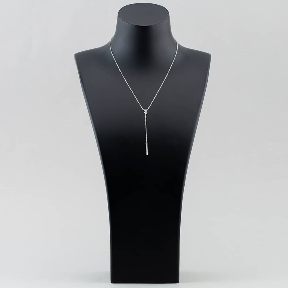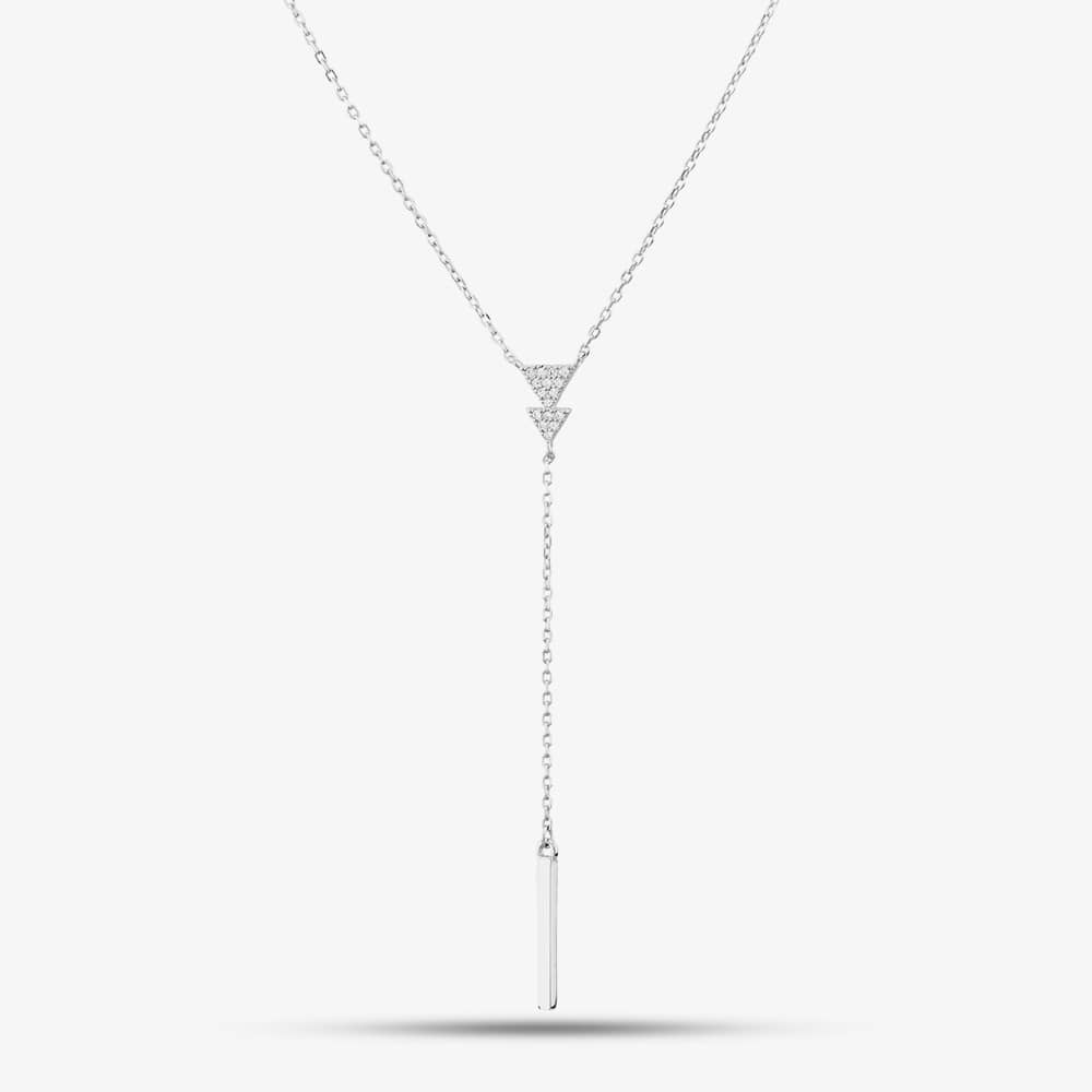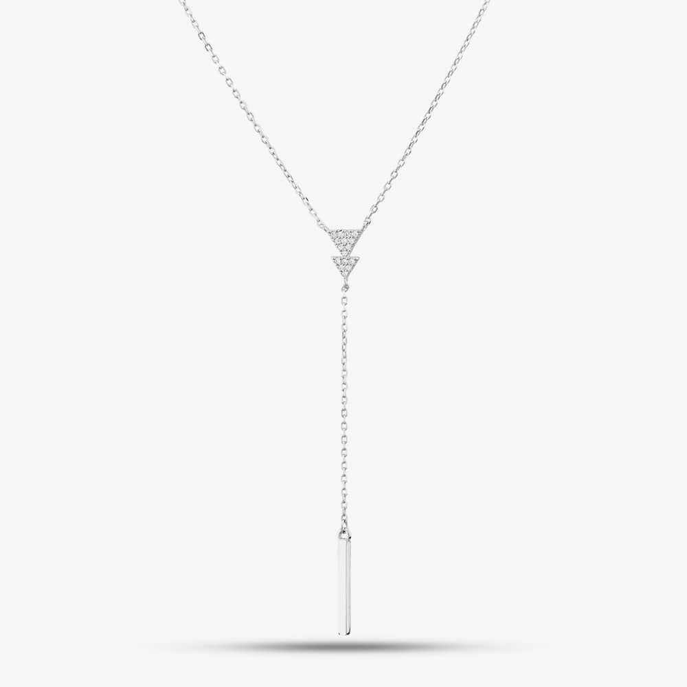 A pretty sterling silver lariat necklace composed of a belcher chain with central triangular sections set with sparkling white cubic zirconia stones.