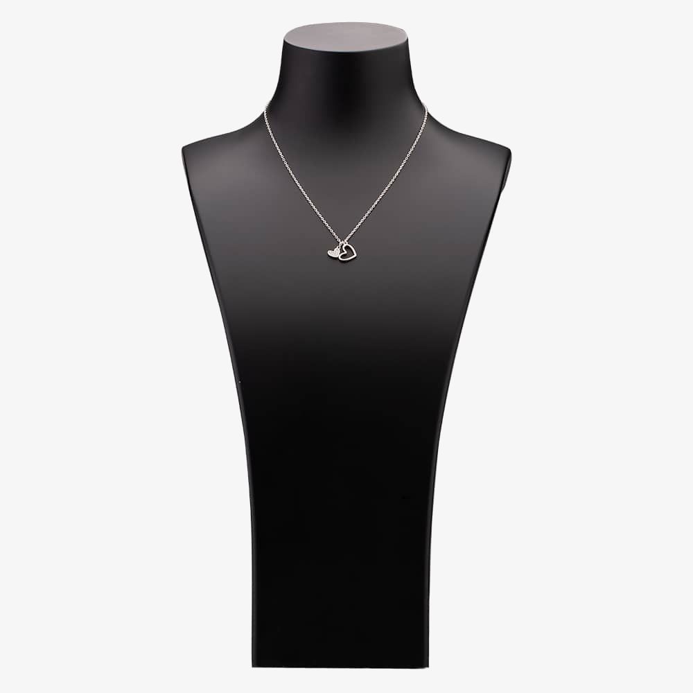 A pretty sterling silver necklace composed of a belcher chain and two hearts. The smaller heart is also set with sparkling white cubic zirconia stones.
