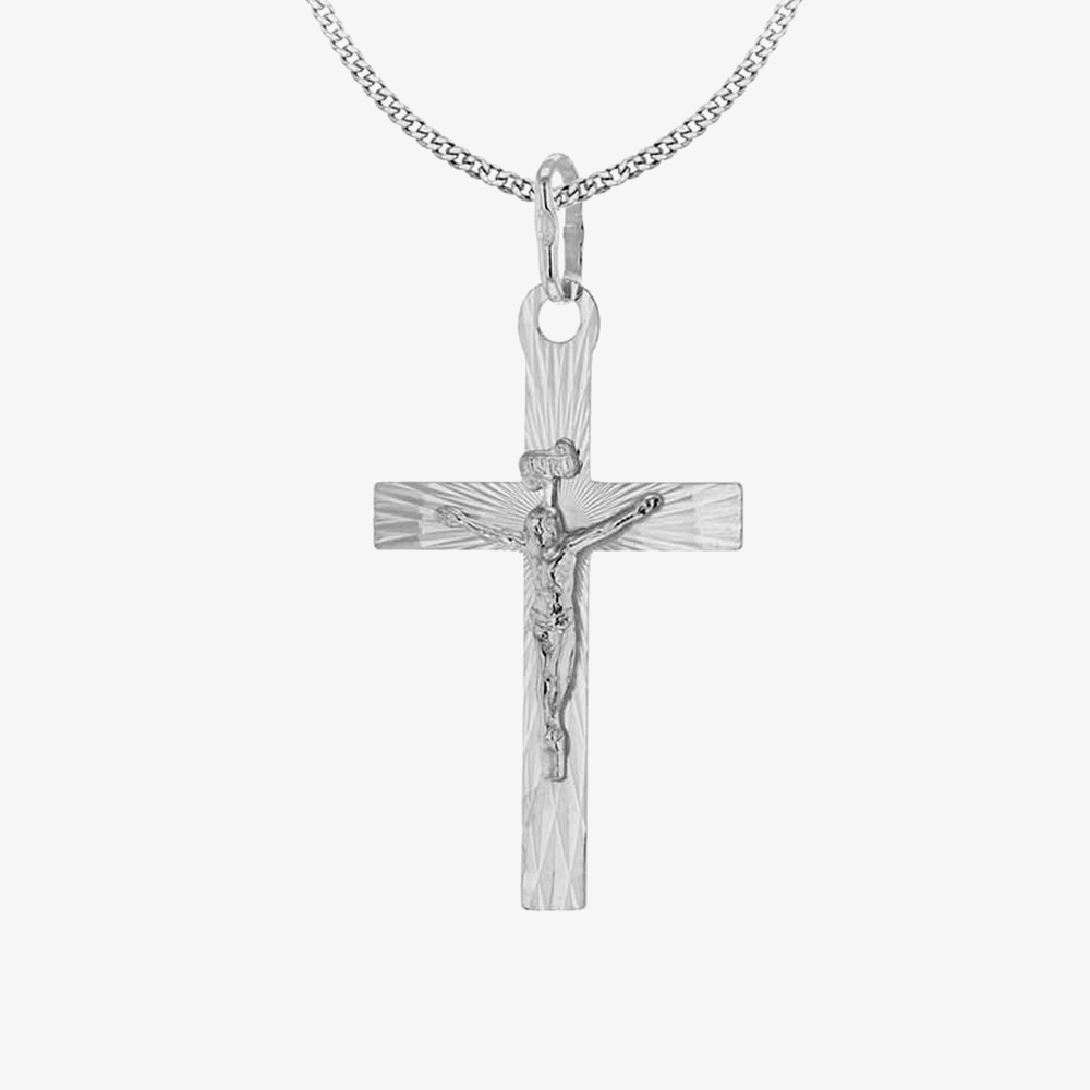 Offering classic styling, the Sterling Silver Diamond-Cut Crucifix Pendant 8.64.3061 is made from rhodium plated sterling silver and measures 21mm x 40.7mm in size, and features an intricately engraved crucifix detailing on a diamond-cut textured cross. Pendant is fitted on to the Sterling Silver Open Curb Chain Necklace 13-05-41N.