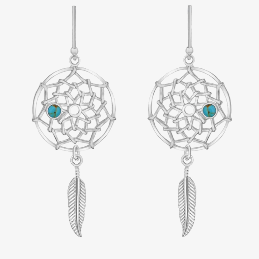 Introducing this stunning pair of sterling silver dream-catcher earrings, a beautiful accessory for a spiritual someone. The intricate open work sterling silver design is adorned with a tantalising turquoise beads and detailed feather droppers. Pair with the matching pendant to complete the look, buy with confidence.