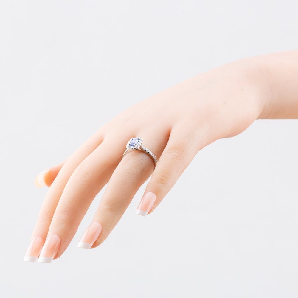 Exquisitely crafted in sterling silver, this sophisticated cluster ring features a striking emerald-cut tanzanite at its centre. The gemstone's deep violet-blue hue is enhanced by a sparkling halo of white cubic zirconia, creating a radiant contrast. Additional cubic zirconia stones line the shoulders, adding brilliance and elegance from every angle. A timeless piece with modern appeal, this ring is perfect for both special occasions and everyday luxury.