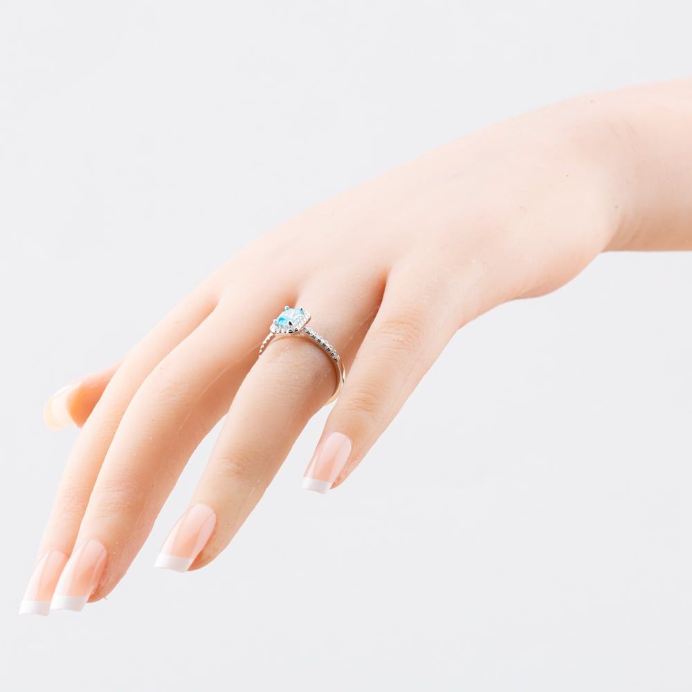 Crafted in sleek sterling silver, this elegant cluster ring features a captivating emerald-cut blue cubic zirconia at its heart. The vibrant blue gemstone is surrounded by a sparkling halo of white cubic zirconia, creating a dazzling contrast that draws the eye. The shoulders of the ring are also adorned with cubic zirconia accents, adding a touch of brilliance from every angle. Sophisticated and timeless, this ring is perfect for adding a refined sparkle to any look.