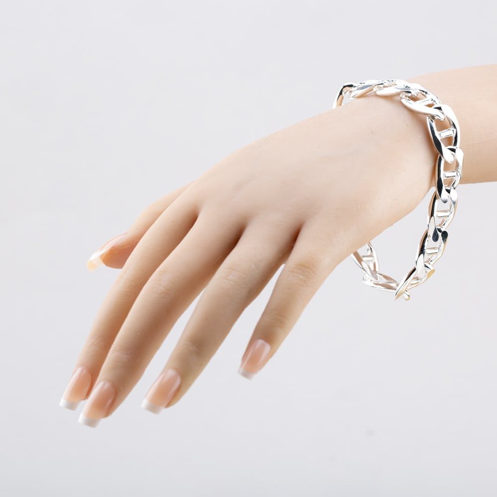 Crafted from high-quality sterling silver, this bracelet boasts a brilliant, polished finish that beautifully reflects light, exuding an air of modern luxury. The flat construction ensures it lies comfortably and smoothly against your wrist, making it ideal for continuous wear.