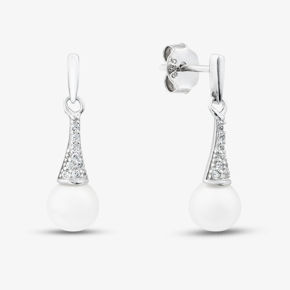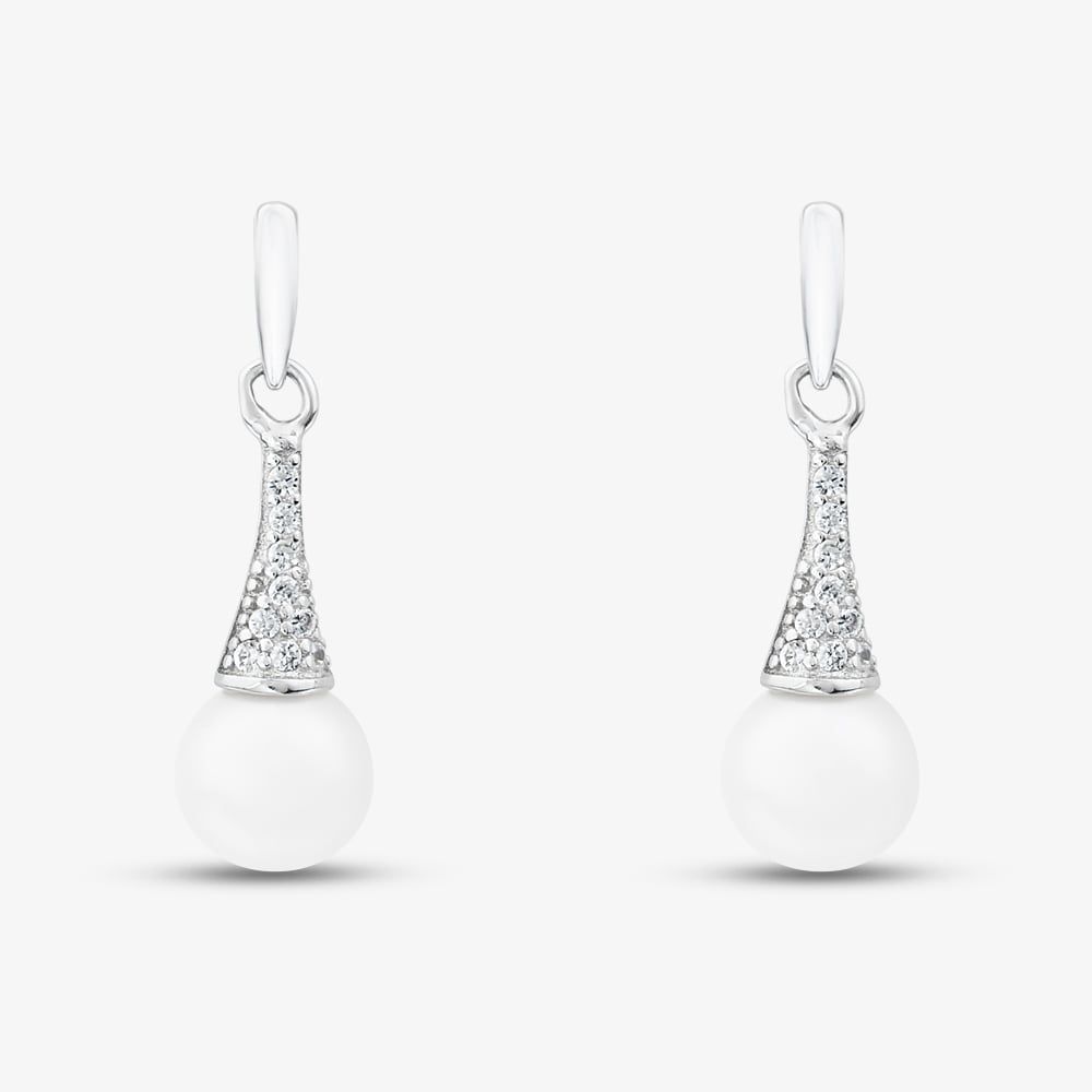 Inspired by the Art Deco era, these elegant earrings are crafted from sterling silver and feature a classic drop design. White sparkling cubic zirconia are set into the cool hues of the silver metal and are complemented by a lustrous freshwater pearl nestled below. Complete with post and butterfly fastenings for a secure and comfortable fit, these earrings make a great gift and a perfect for adding glamour to your evening style.
