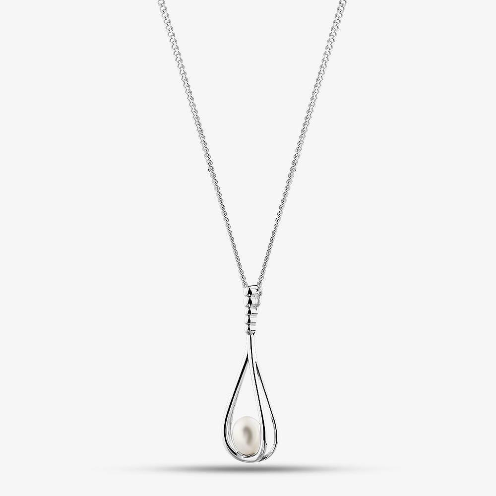 Perfect for every day wear or adding glamour to your evening style, this necklace features an openwork tear drop shaped pendant with a lustrous freshwater pearl nestled inside. Crafted from sterling silver, the bead design bale is suspended from a rope chain to create a timeless piece to be treasured.