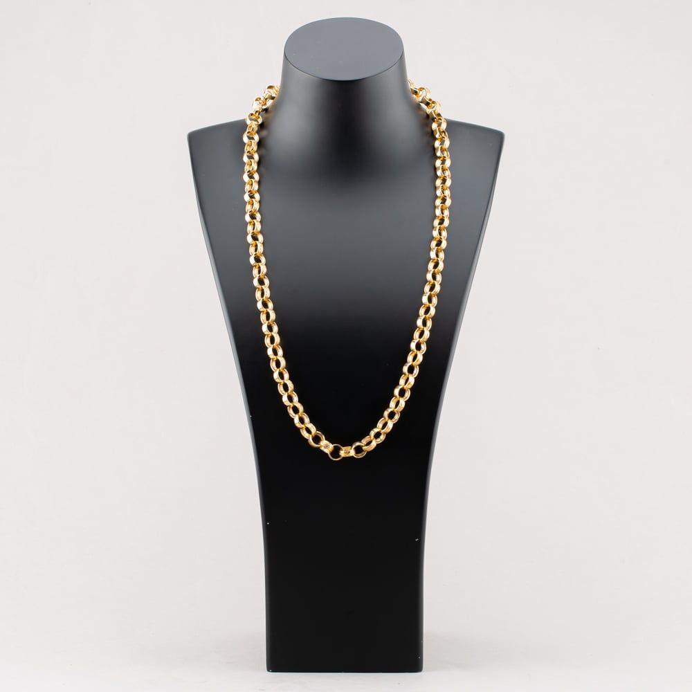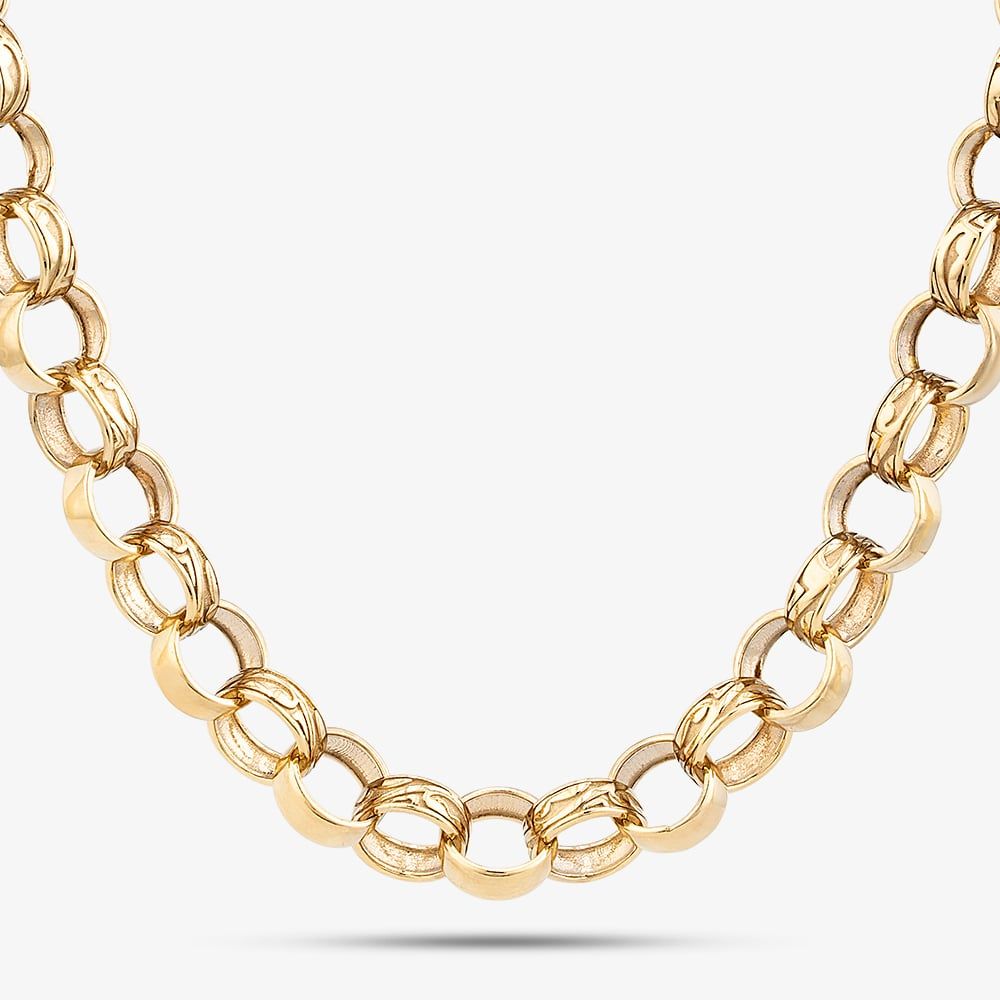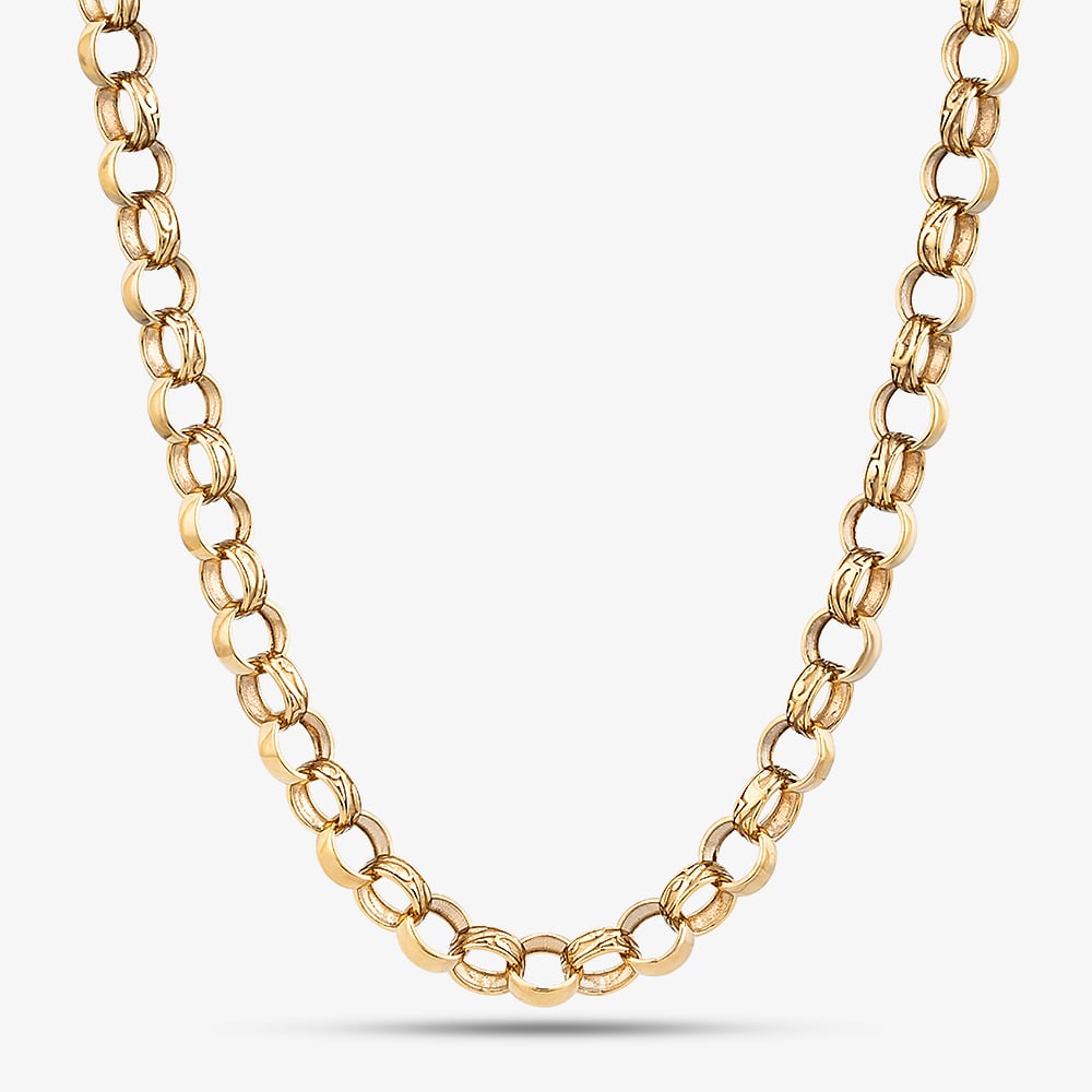 This Sterling Silver Gold Tone 24-Inch Patterned Belcher Chain Necklace features classic round links with intricate texturing and a rich gold-tone finish. Crafted from premium sterling silver, it offers a bold yet refined look—perfect for making a statement on its own or layering with other pieces.