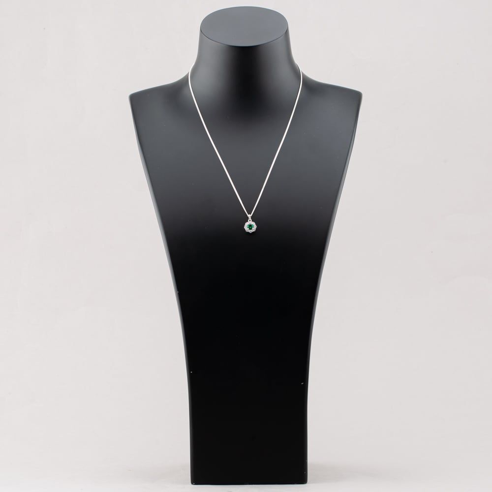 Elegant and eye-catching, this sterling silver necklace features a finely crafted rope chain and a radiant pendant showcasing a brilliant green cubic zirconia stone at its heart. Surrounding the centre stone is a halo of sparkling white cubic zirconia, creating a beautiful contrast that catches the light from every angle. Secured with a bolt ring clasp, this piece is perfect for day or night wear.