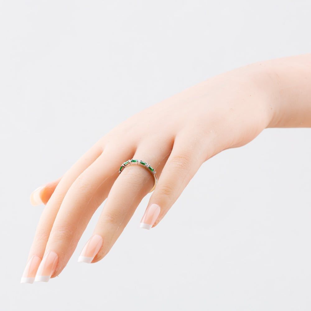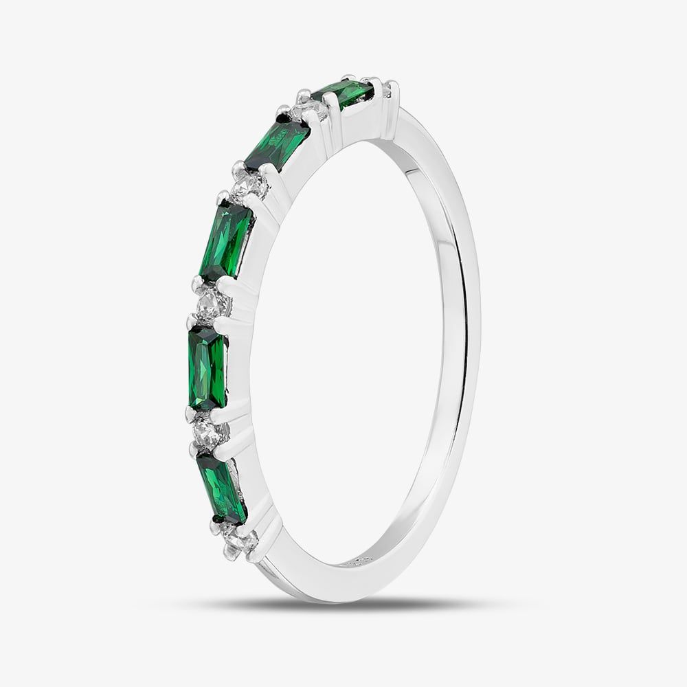 This beautiful sterling silver half eternity ring features alternating white and green cubic zirconia stones, creating a vibrant and sparkling design. Perfect for adding a touch of colour and elegance to any look, it’s a timeless piece that shines from every angle.