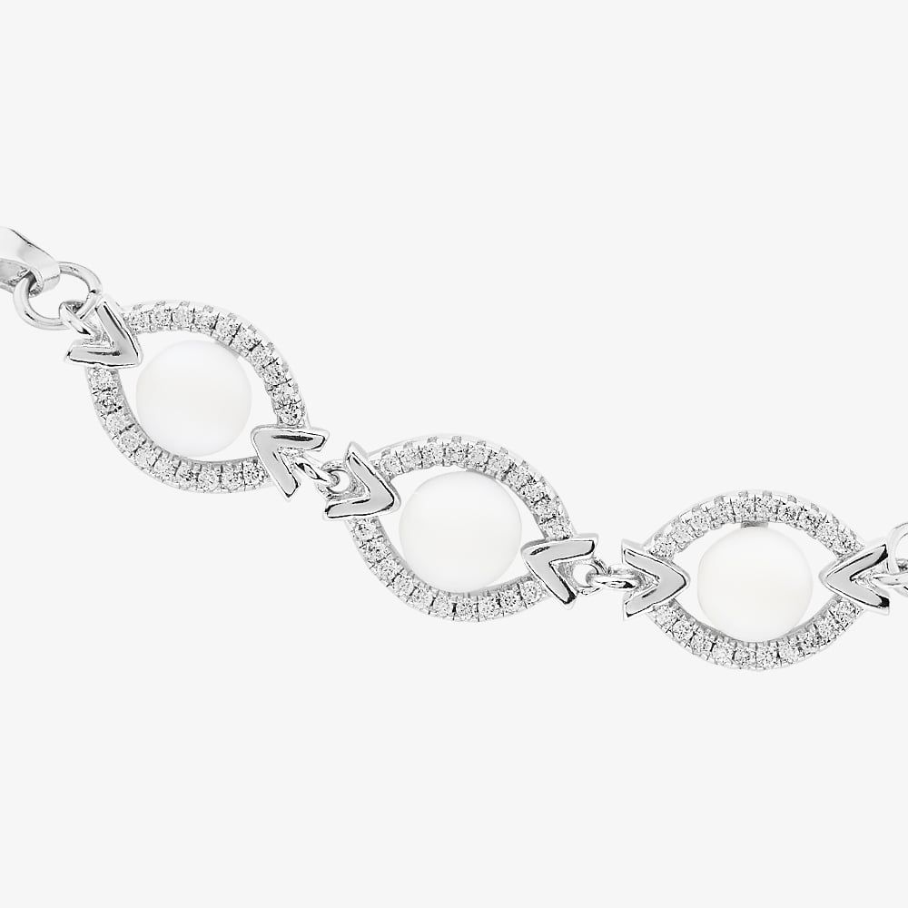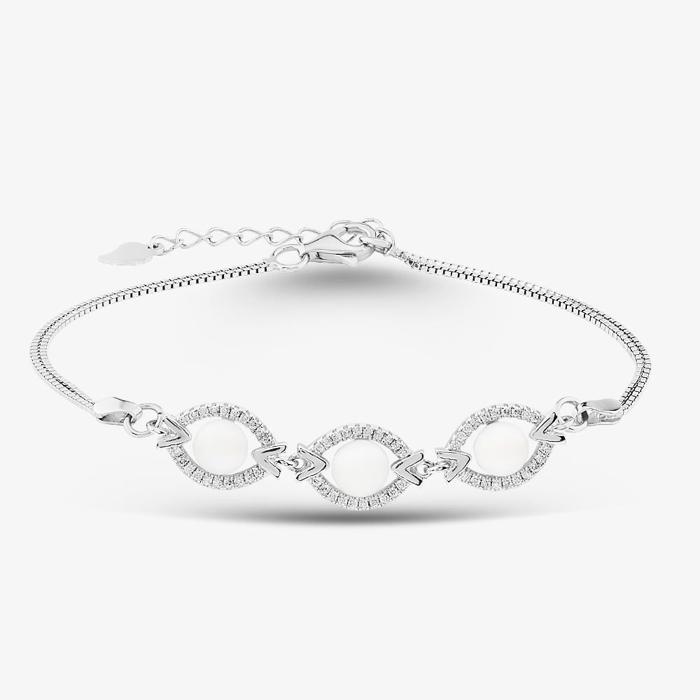 Crafted from sterling silver, this elegant bracelet has a triple open link design set with sparkling cubic zirconia, each cradling a lustrous freshwater pearl. Complete with a double row box chain and extender for an adjustable fit this bracelet is a fine choice for adding subtle glamour to your evening look.