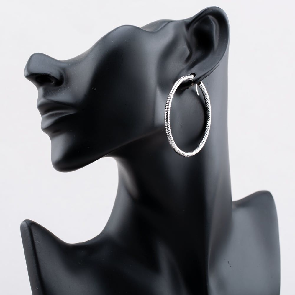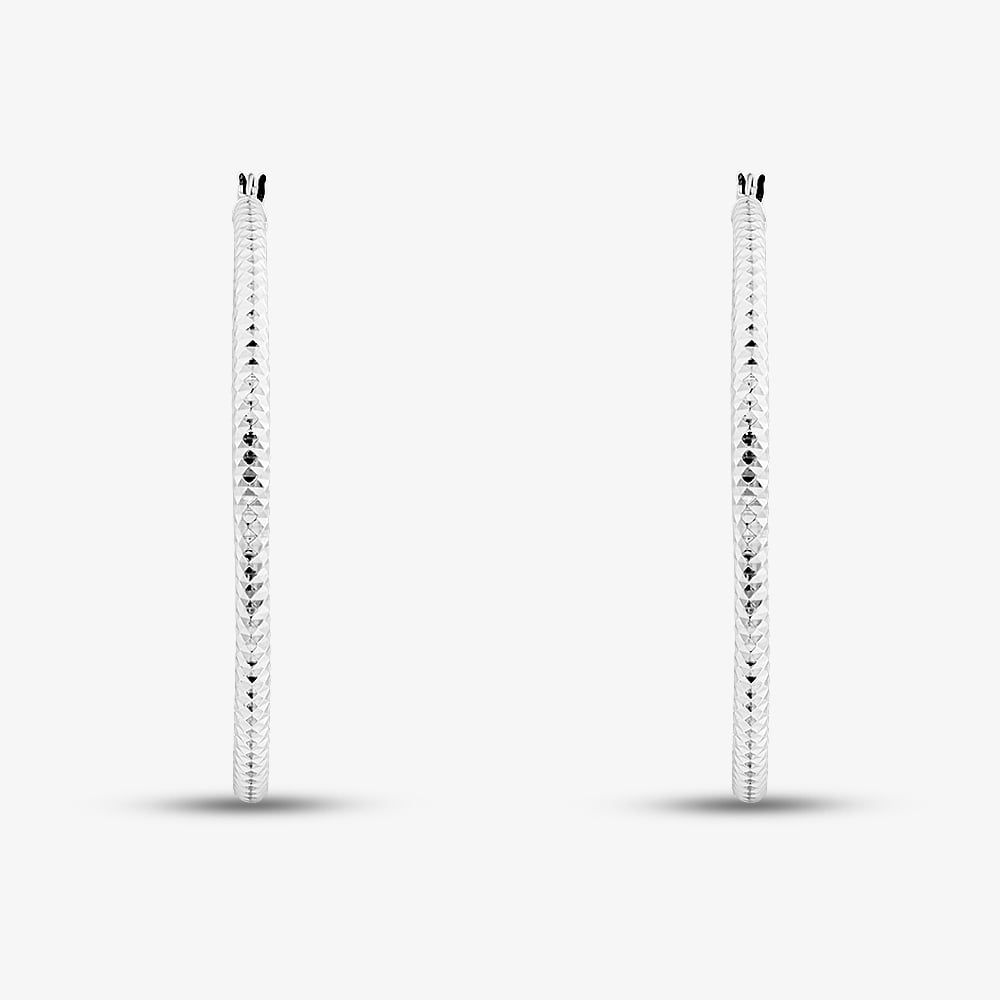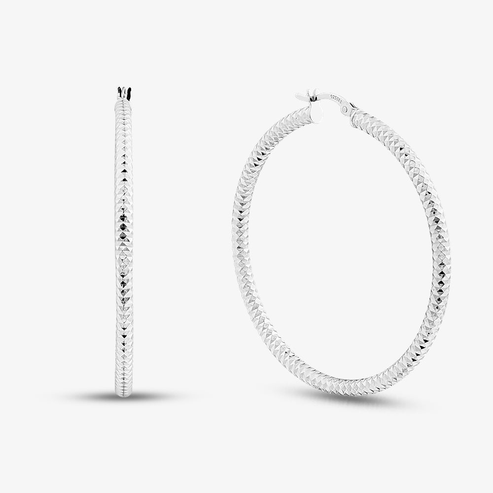 Crafted from high-quality sterling silver and expertly enhanced with rhodium plating, these earrings offer exceptional brilliance and resistance to tarnish, mirroring the luxurious look of white gold. Each hoop features intricate diamond-cut detailing. This unique texture adds a continuous shimmer, ensuring you sparkle from every angle.
