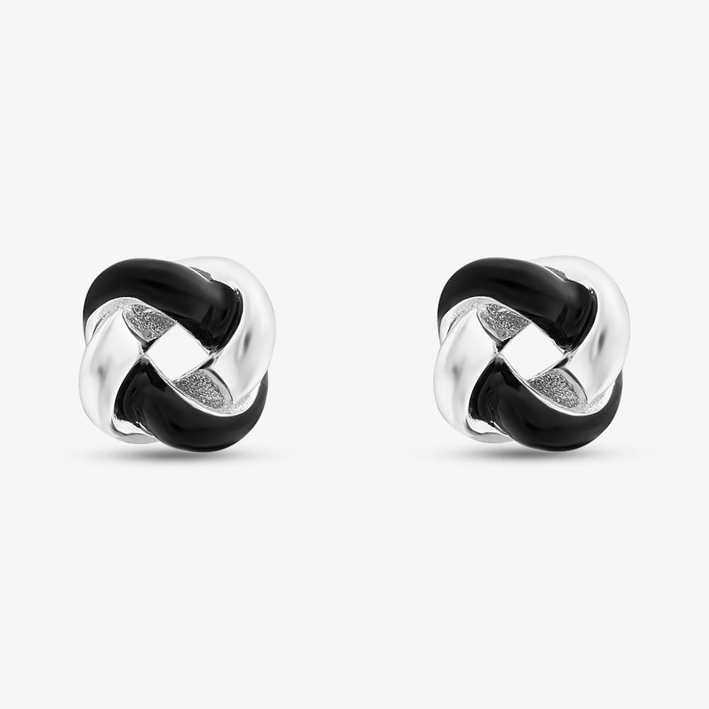 Delicate and chic, these earrings are the perfect everyday accessory. Crafted from high-quality sterling silver and enhanced with a durable rhodium plating, these studs resist tarnishing while maintaining a brilliant shine. The elegant knot design, finished with smooth black enamel, adds a subtle yet stylish touch to any outfit. Lightweight and comfortable, these versatile earrings effortlessly combine modern simplicity with timeless charm.